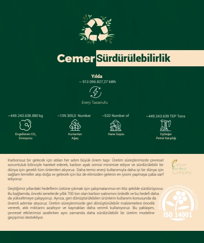 34Karbonsuz bir gelecek i%u00e7in at%u0131lan her ad%u0131m b%u00fcy%u00fck %u00f6nem ta%u015f%u0131r. %u00dcretim s%u00fcre%u00e7lerimizde %u00e7evresel sorumluluk bilinciyle hareket ederek, karbon ayak izimizi minimize ediyor ve s%u00fcrd%u00fcr%u00fclebilir bir d%u00fcnya i%u00e7in gerekli t%u00fcm %u00f6nlemleri al%u0131yoruz. Daha temiz enerji kullan%u0131m%u0131yla daha iyi bir d%u00fcnya i%u00e7in sa%u011flam temeller at%u0131p do%u011fa ve gelecek i%u00e7in biz de elimizden gelenin en iyisini yapmaya %u00e7aba sarf ediyoruz. Ge%u00e7ti%u011fimiz y%u0131llardaki hedeflerin %u00fcst%u00fcne %u00e7%u0131kmak i%u00e7in %u00e7al%u0131%u015fmalar%u0131m%u0131z%u0131 en titiz %u015fekilde s%u00fcrd%u00fcr%u00fcyoruz. Bu ba%u011flamda, %u00f6nceki senelerde y%u0131ll%u0131k 700 ton olan karbon sal%u0131n%u0131m%u0131n%u0131 %u00f6nledik ve bu hedefi daha da y%u00fckseltmeye %u00e7al%u0131%u015f%u0131yoruz. Ayr%u0131ca, geri d%u00f6n%u00fc%u015ft%u00fcr%u00fclebilen %u00fcr%u00fcnlerin kullan%u0131m%u0131 konusunda da %u00f6nemli ad%u0131mlar at%u0131yoruz. %u00dcretim s%u00fcre%u00e7lerimizde geri d%u00f6n%u00fc%u015ft%u00fcr%u00fclebilir malzemelere %u00f6ncelik vererek, at%u0131k miktar%u0131n%u0131 azalt%u0131yor ve kaynaklar%u0131 daha verimli kullan%u0131yoruz. Bu yakla%u015f%u0131m, %u00e7evresel etkilerimizi azalt%u0131rken ayn%u0131 zamanda daha s%u00fcrd%u00fcr%u00fclebilir bir %u00fcretim modeline ge%u00e7i%u015fimizi destekliyor. Cemer~ 912.096.827,27 kWh~449.243.638.880 kg ~109.305,0 Number ~532 Number of ~449.243.639 TEP TonsS%u00fcrd%u00fcr%u00fclebilirlikY%u0131ldaEnerji TasarrufuEngellenen CO2EmisyonuKurtar%u0131lanA%u011fa%u00e7Hane Say%u0131s%u0131 E%u015fDe%u011ferPetrol Kar%u015f%u0131l%u0131%u011f%u0131