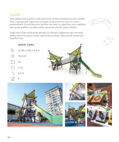 346Orta %u00e7a%u011fdan kalma gotik bir kale g%u00f6r%u00fcn%u00fcm%u00fc verilerek tasarlanm%u0131%u015f olan Castello serisi, hayal g%u00fcc%u00fcne dayal%u0131 oyun kurgular%u0131 olu%u015fturmak i%u00e7in e%u015fsiz bir ortam yaratmaktad%u0131r. Konstr%u00fcksiyonun kendine has %u015fekil ve %u00e7izgileriyle uyum sa%u011flayan kale temal%u0131 grafikler %u00e7ocuklara adeta zamanda yolculuk yapt%u0131rmaktad%u0131r.Do%u011fal renk tonlar%u0131 kullan%u0131larak ger%u00e7ek%u00e7i bir deneyim sa%u011flanm%u0131%u015f ayn%u0131 zamanda aralara eklenmi%u015f uyar%u0131c%u0131 renkler sayesinde %u00e7ocuklar%u0131n daha enerjik hissetmesi hedeflenmi%u015ftir.Castello11,35 x 3,55 x 5,4 m70,0 m%u00b2252-122,3 m9GGCS 1001