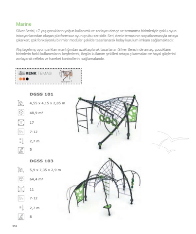 358RENK TEMASISilver Serisi, +7 ya%u015f %u00e7ocuklar%u0131n yo%u011fun kullan%u0131ml%u0131 ve zorlay%u0131c%u0131 denge ve t%u0131rmanma birimleriyle %u00e7oklu oyun istasyonlar%u0131ndan olu%u015fan platformsuz oyun grubu serisidir. Seri, deniz temas%u0131n%u0131n soyutlanmas%u0131yla ortaya %u00e7%u0131karken; %u00e7ok fonksiyonlu birimler mod%u00fcler %u015fekilde tasarlanarak kolay kurulum imkan%u0131 sa%u011flamaktad%u0131r. Al%u0131%u015f%u0131lagelmi%u015f oyun parklar%u0131 mant%u0131%u011f%u0131ndan uzakla%u015f%u0131larak tasarlanan Silver Serisi%u2019nde ama%u00e7; %u00e7ocuklar%u0131n birimlerin farkl%u0131 kullan%u0131mlar%u0131n%u0131 ke%u015ffederek, %u00f6zg%u00fcn kullan%u0131m %u015fekilleri ortaya %u00e7%u0131karmalar%u0131 ve hayal g%u00fc%u00e7lerini zorlayarak refleks ve hareket kontrollerini sa%u011flamalar%u0131d%u0131r.Marine4,55 x 4,15 x 2,85 m5,9 x 7,35 x 2,9 m48,9 m%u00b264,4 m%u00b217117-127-122,7 m52,7 m8 DGSS 101DGSS 103opsiyon 1