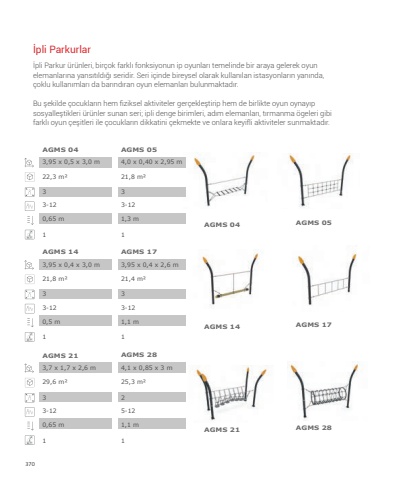 3703,95 x 0,5 x 3,0 m3,95 x 0,4 x 3,0 m3,7 x 1,7 x 2,6 m4,0 x 0,40 x 2,95 m3,95 x 0,4 x 2,6 m4,1 x 0,85 x 3 m22,3 m%u00b221,8 m%u00b229,6 m%u00b221,8 m%u00b221,4 m%u00b225,3 m%u00b23333323-123-123-123-123-125-120,65 m1110,5 m0,65 m1,3 m1111,1 m1,1 mAGMS 04AGMS 14AGMS 21AGMS 04AGMS 14AGMS 21AGMS 05AGMS 17AGMS 28AGMS 05AGMS 17AGMS 28%u0130pli Parkur %u00fcr%u00fcnleri, bir%u00e7ok farkl%u0131 fonksiyonun ip oyunlar%u0131 temelinde bir araya gelerek oyun elemanlar%u0131na yans%u0131t%u0131ld%u0131%u011f%u0131 seridir. Seri i%u00e7inde bireysel olarak kullan%u0131lan istasyonlar%u0131n yan%u0131nda, %u00e7oklu kullan%u0131mlar%u0131 da bar%u0131nd%u0131ran oyun elemanlar%u0131 bulunmaktad%u0131r. Bu %u015fekilde %u00e7ocuklar%u0131n hem fiziksel aktiviteler ger%u00e7ekle%u015ftirip hem de birlikte oyun oynay%u0131p sosyalle%u015ftikleri %u00fcr%u00fcnler sunan seri; ipli denge birimleri, ad%u0131m elemanlar%u0131, t%u0131rmanma %u00f6geleri gibi farkl%u0131 oyun %u00e7e%u015fitleri ile %u00e7ocuklar%u0131n dikkatini %u00e7ekmekte ve onlara keyifli aktiviteler sunmaktad%u0131r.%u0130pli Parkurlar