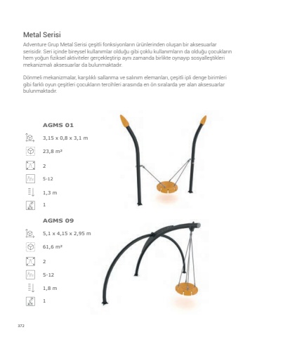 372Adventure Grup Metal Serisi %u00e7e%u015fitli fonksiyonlar%u0131n %u00fcr%u00fcnlerinden olu%u015fan bir aksesuarlar serisidir. Seri i%u00e7inde bireysel kullan%u0131mlar oldu%u011fu gibi %u00e7oklu kullan%u0131mlar%u0131n da oldu%u011fu %u00e7ocuklar%u0131n hem yo%u011fun fiziksel aktiviteler ger%u00e7ekle%u015ftirip ayn%u0131 zamanda birlikte oynay%u0131p sosyalle%u015ftikleri mekanizmal%u0131 aksesuarlar da bulunmaktad%u0131r. D%u00f6nmeli mekanizmalar, kar%u015f%u0131l%u0131kl%u0131 sallanma ve sal%u0131n%u0131m elemanlar%u0131, %u00e7e%u015fitli ipli denge birimleri gibi farkl%u0131 oyun %u00e7e%u015fitleri %u00e7ocuklar%u0131n tercihleri aras%u0131nda en %u00f6n s%u0131ralarda yer alan aksesuarlar bulunmaktad%u0131r.Metal Serisi3,15 x 0,8 x 3,1 m23,8 m%u00b225-121,3 m1AGMS 01AGMS 095,1 x 4,15 x 2,95 m61,6 m%u00b225-121,8 m1