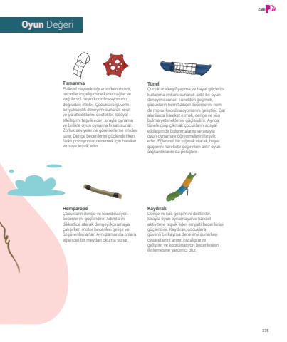 375Oyun De%u011feriKayd%u0131rakDenge ve kas geli%u015fimini destekler. S%u0131rayla oyun oynamaya ve fiziksel aktiviteye te%u015fvik eder, empati becerilerini g%u00fc%u00e7lendirir. Kayd%u0131rak, %u00e7ocuklara g%u00fcvenli bir kayma deneyimi sunarken cesaretlerini art%u0131r%u0131r, h%u0131z alg%u0131lar%u0131n%u0131 geli%u015ftirir ve koordinasyon becerilerinin ilerlemesine yard%u0131mc%u0131 olur.Hemparope%u00c7ocuklar%u0131n denge ve koordinasyon becerilerini g%u00fc%u00e7lendirir. Ad%u0131mlar%u0131n%u0131 dikkatlice atarak dengeyi korumaya %u00e7al%u0131%u015f%u0131rken motor becerileri geli%u015fir ve %u00f6zg%u00fcvenleri artar. Ayn%u0131 zamanda onlara e%u011flenceli bir meydan okuma sunar.T%u00fcnel %u00c7ocuklara ke%u015fif yapma ve hayal g%u00fc%u00e7lerini kullanma imkan%u0131 sunarak aktif bir oyun deneyimi sunar. T%u00fcnelden ge%u00e7mek, %u00e7ocuklar%u0131n hem fiziksel becerilerini hem de motor koordinasyonlar%u0131n%u0131 geli%u015ftirir. Dar alanlarda hareket etmek, denge ve y%u00f6n bulma yeteneklerini g%u00fc%u00e7lendirir. Ayr%u0131ca, t%u00fcnele girip %u00e7%u0131kmak %u00e7ocuklar%u0131n sosyal etkile%u015fimde bulunmalar%u0131n%u0131 ve s%u0131rayla oyun oynamay%u0131 %u00f6%u011frenmelerini te%u015fvik eder. E%u011flenceli bir s%u0131%u011f%u0131nak olarak, hayal g%u00fc%u00e7lerini harekete ge%u00e7irirken aktif oyun al%u0131%u015fkanl%u0131klar%u0131n%u0131 da peki%u015ftirir.T%u0131rmanmaFiziksel dayan%u0131kl%u0131l%u0131%u011f%u0131 art%u0131r%u0131rken motor becerilerin geli%u015fimine katk%u0131 sa%u011flar ve sa%u011f ile sol beyin koordinasyonunu do%u011frudan etkiler. %u00c7ocuklara g%u00fcvenli bir y%u00fckseklik deneyimi sunarak ke%u015fif ve yarat%u0131c%u0131l%u0131klar%u0131n%u0131 destekler. Sosyal etkile%u015fimi te%u015fvik eder; s%u0131rayla oynama ve birlikte oyun oynama f%u0131rsat%u0131 sunar. Zorluk seviyelerine g%u00f6re ilerleme imk%u00e2n%u0131 tan%u0131r. Denge becerilerini g%u00fc%u00e7lendirirken, farkl%u0131 pozisyonlar denemek i%u00e7in hareket etmeye te%u015fvik eder.