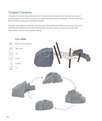 382Tungsten t%u0131rmanma kaya g%u00f6r%u00fcn%u00fcml%u00fc bir t%u0131rmanma ekipman%u0131d%u0131r. Bu t%u0131rmanma oyunca%u011f%u0131 4 ana par%u00e7adan olu%u015fmakta ve b%u00f6ylece mod%u00fcler bir yap%u0131ya sahip olmaktad%u0131r. Her bir t%u0131rmanma kendi i%u00e7inde de par%u00e7alara b%u00f6l%u00fcnebilmektedir. Par%u00e7alar hem ba%u011f%u0131ms%u0131z %u015fekilde tek ba%u015flar%u0131na kullan%u0131labilecek %u015fekilde tasarlanm%u0131%u015f olup hem de ikili kombinasyonlara da %u015fans tan%u0131maktad%u0131r. B%u00f6ylece alana ve ihtiyaca y%u00f6nelik farkl%u0131 alternatifler sunma imkan%u0131 yaratmaktad%u0131r.8,15 x 5,3 x 2,6 m70,1 m%u00b2175-122,0 m3Tungsten T%u0131rmanmaCA 1900