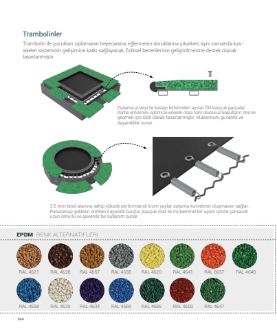 394Trambolin ile %u00e7ocuklar%u0131 z%u0131plaman%u0131n heyecan%u0131na, e%u011flencenin doruklar%u0131na %u00e7%u0131karken, ayn%u0131 zamanda kasiskelet sisteminin geli%u015fimine katk%u0131 sa%u011flayacak, fiziksel becerilerinin geli%u015ftirilmesine destek olacak tasarlanm%u0131%u015ft%u0131r.TrambolinlerZ%u0131plama y%u00fczeyi ile kasay%u0131 birbirinden ay%u0131ran fitil kau%u00e7uk par%u00e7alar, darbe emilimini optimize ederek olas%u0131 t%u00fcm olumsuz ko%u015fullar%u0131n %u00f6n%u00fcne ge%u00e7mek i%u00e7in %u00f6zel olarak tasarlanm%u0131%u015ft%u0131r. Maksimum g%u00fcvenlik ve dayan%u0131kl%u0131l%u0131k sunar.3.5 mm kesit alan%u0131na sahip y%u00fcksek performansl%u0131 krom yaylar z%u0131plama kuvvetinin olu%u015fmas%u0131n%u0131 sa%u011flar. Paslanmaz %u00e7elikten %u00fcretilen dayan%u0131kl%u0131 bur%u00e7lar, kau%u00e7uk mat ile m%u00fckemmel bir uyum i%u00e7inde %u00e7al%u0131%u015farak uzun %u00f6m%u00fcrl%u00fc ve g%u00fcvenilir bir kullan%u0131m sunarRAL 4621 RAL 4657 RAL 4620 RAL 6657RAL 4658 RAL 4634 RAL 4656 RAL 4647RAL 4628 RAL 4638 RAL 4641 RAL 4640RAL 4629 RAL 4659 RAL 4600EPDM RENK ALTERNAT%u0130FLER%u0130