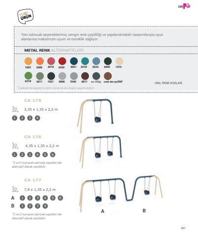 3973,35 x 1,35 x 2,2 m 4,35 x 1,35 x 2,2 m *5 ve 6 numaral%u0131 sal%u0131ncak sepetleri tek alternatif olarak se%u00e7ilebilir. *5 ve 6 numaral%u0131 sal%u0131ncak sepetleri tek alternatif olarak se%u00e7ilebilir.7,9 x 1,35 x 2,2 mCA 175CA 176CA 17711112222333355444466AABBMETAL RENK ALTERNAT%u0130FLER%u01301003*RAL RENK KODLARI2008 3018 3020 5001 50187021502490066009 10156018 6011 7040 8011 sw 306g core ten xy355fYeni sal%u0131ncak se%u00e7eneklerimiz, zengin renk %u00e7e%u015fitlili%u011fi ve yap%u0131land%u0131r%u0131labilir tasar%u0131mlar%u0131yla oyun alanlar%u0131na maksimum uyum ve esneklik sa%u011fl%u0131yor.%u00dcR%u00dcN*%u00d6zelle%u015ftirme taleplerine ili%u015fkin %u00fcr%u00fcnlerde liste fiyatlar%u0131 ge%u00e7erli de%u011fildir.