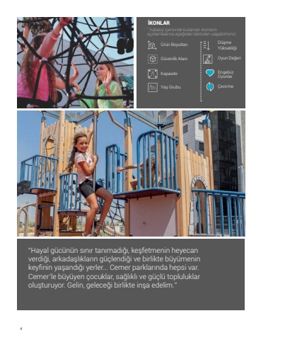 4%u201cHayal g%u00fcc%u00fcn%u00fcn s%u0131n%u0131r tan%u0131mad%u0131%u011f%u0131, ke%u015ffetmenin heyecan verdi%u011fi, arkada%u015fl%u0131klar%u0131n g%u00fc%u00e7lendi%u011fi ve birlikte b%u00fcy%u00fcmenin keyfinin ya%u015fand%u0131%u011f%u0131 yerler... Cemer parklar%u0131nda hepsi var. Cemer%u2019le b%u00fcy%u00fcyen %u00e7ocuklar, sa%u011fl%u0131kl%u0131 ve g%u00fc%u00e7l%u00fc topluluklar olu%u015fturuyor. Gelin, gelece%u011fi birlikte in%u015fa edelim.%u201d%u00dcr%u00fcn Boyutlar%u0131 Engelsiz Oyunlar%u0130KONLAR* Katalog i%u00e7erisinde kullan%u0131lan ikonlar%u0131n a%u00e7%u0131klamalar%u0131na a%u015fa%u011f%u0131daki tablodan ula%u015fabilirsiniz.G%u00fcvenlik Alan%u0131%u00c7evirmeKapasiteYa%u015f GrubuD%u00fc%u015fme Y%u00fcksekli%u011fiOyun De%u011feri