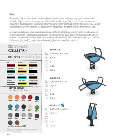 4100,65 x 0,4 x 0,75 m1,15 x 0,4 x 0,7 m0,45 x 0,5 x 1,05 m6,7 m%u00b210,3 m%u00b210,3 m%u00b21212-122-123-120,6 m0,6 m1,0 mDGSS 31DGSS 32DGSS 33Ring serisi, %u00e7ocuklar%u0131n sal%u0131n%u0131m hareketiyle oyun oynamas%u0131n%u0131 sa%u011flayan yayl%u0131 oyun aksesuarlar%u0131 serisidir. Soyut tasar%u0131m%u0131 ile geleneksel sal%u0131n%u0131m elemanlar%u0131na yenilik%u00e7i bir g%u00f6r%u00fcn%u00fcm vermesi ve %u00e7ocuklar%u0131n hayal g%u00fc%u00e7lerini kullanarak e%u011flenmelerine yard%u0131mc%u0131 olmas%u0131 beklenirken %u00f6zellikle 2 ve %u00fczeri ya%u015f grubu %u00e7ocuklar%u0131n psikomotor becerilerinin geli%u015fmesini de desteklemesi %u00f6ng%u00f6r%u00fclmektedir. Ayn%u0131 zamanda bu ya%u015f grubu %u00e7ocuklar%u0131n daha %u00e7ok tercih etti%u011fi bu oyun elemanlar%u0131nda bulunan el ve ayak destekleri %u00e7ocuklara daha g%u00fcvenli ve ergonomik bir oyun deneyimi sunmaktad%u0131r. Seride bulunan tahterevalli ve sal%u0131n%u0131m eleman%u0131 z%u0131pz%u0131plar%u0131n farkl%u0131 versiyonlar%u0131 ile bireysel veya grup halinde kullan%u0131m sa%u011flanarak %u00e7ocu%u011fun sosyalle%u015ferek e%u011flenmesi hedeflenmektedirRing %u00dcR%u00dcNLER%u0130 %u00d6ZELLE%u015eT%u0130R%u0130NREDORANGE BLACKWALNUTGRANITEYELLOW CAFE MOCCHADARK GREENLIGHT GREY LIGHT BLUELIGHT GREEN COLORADO OAKHPL RENK ALTERNAT%u0130FLER%u0130METAL RENK ALTERNAT%u0130FLER%u01301003 2008 3018 3020 500150187021502490066009 1015 60186011 7040 8011sw 306g core ten xy355f*%u00d6zelle%u015ftirme taleplerine ili%u015fkin %u00fcr%u00fcnlerde liste fiyatlar%u0131 ge%u00e7erli de%u011fildir.