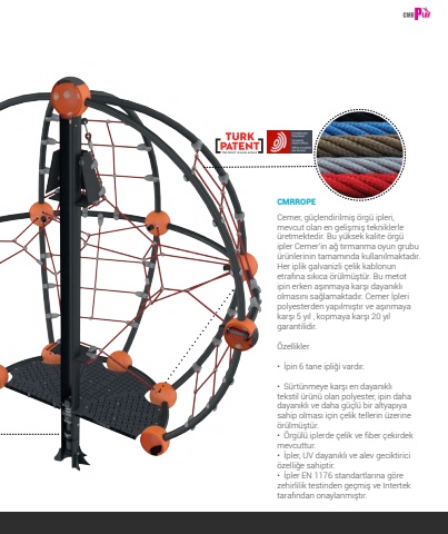 43Cemer, g%u00fc%u00e7lendirilmi%u015f %u00f6rg%u00fc ipleri, mevcut olan en geli%u015fmi%u015f tekniklerle %u00fcretmektedir. Bu y%u00fcksek kalite %u00f6rg%u00fc ipler Cemer%u2019in a%u011f t%u0131rmanma oyun grubu %u00fcr%u00fcnlerinin tamam%u0131nda kullan%u0131lmaktad%u0131r. Her iplik galvanizli %u00e7elik kablonun etraf%u0131na s%u0131k%u0131ca %u00f6r%u00fclm%u00fc%u015ft%u00fcr. Bu metot ipin erken a%u015f%u0131nmaya kar%u015f%u0131 dayan%u0131kl%u0131 olmas%u0131n%u0131 sa%u011flamaktad%u0131r. Cemer %u0130pleri polyesterden yap%u0131lm%u0131%u015ft%u0131r ve a%u015f%u0131nmaya kar%u015f%u0131 5 y%u0131l , kopmaya kar%u015f%u0131 20 y%u0131l garantilidir.%u00d6zellikler%u2022 %u0130pin 6 tane ipli%u011fi vard%u0131r.%u2022 S%u00fcrt%u00fcnmeye kar%u015f%u0131 en dayan%u0131kl%u0131 tekstil %u00fcr%u00fcn%u00fc olan polyester, ipin daha dayan%u0131kl%u0131 ve daha g%u00fc%u00e7l%u00fc bir altyap%u0131ya sahip olmas%u0131 i%u00e7in %u00e7elik tellerin %u00fczerine %u00f6r%u00fclm%u00fc%u015ft%u00fcr.%u2022 %u00d6rg%u00fcl%u00fc iplerde %u00e7elik ve fiber %u00e7ekirdek mevcuttur.%u2022 %u0130pler, UV dayan%u0131kl%u0131 ve alev geciktirici %u00f6zelli%u011fe sahiptir.%u2022 %u0130pler EN 1176 standartlar%u0131na g%u00f6re zehirlilik testinden ge%u00e7mi%u015f ve Intertek taraf%u0131ndan onaylanm%u0131%u015ft%u0131r.CMRROPE