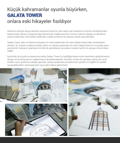 58K%u00fc%u00e7%u00fck kahramanlar oyunla b%u00fcy%u00fcrken, GALATA TOWERonlara eski hikayeler f%u0131s%u0131ld%u0131yorG%u00f6rkemli tarihiyle d%u00fcnya %u015fehirleri aras%u0131nda %u00f6nemli bir yere sahip olan %u0130stanbul%u2019un %u00f6nemli sembollerinden, Galata Kulesi, Bizans %u0130mparatorlu%u011fu d%u00f6neminde, Galata semtinin Ceneviz kolonisi oldu%u011fu on d%u00f6rd%u00fcnc%u00fc y%u00fczy%u0131l ortalar%u0131nda, Cenevizliler taraf%u0131ndan, Galata surlar%u0131n%u0131n bir par%u00e7as%u0131 olarak in%u015fa edilmi%u015ftir.Galata Tower, ad%u0131n%u0131 ve ilham%u0131n%u0131 d%u00fcnyan%u0131n en eski kulelerinden biri olan Galata Kulesi%u2019nden esinlenilerek alm%u0131%u015ft%u0131r. 20. y%u00fczy%u0131l%u0131n ortalar%u0131na kadar %u015fehrin en y%u00fcksek yap%u0131lardan biri olan Galata Kulesi%u2019nin sundu%u011fu e%u015fsiz panoramik manzara, tasarlanan %u00fcr%u00fcnde de yans%u0131t%u0131larak, %u00e7ocuklara masals%u0131 tarihin bir par%u00e7as%u0131 olma imkan%u0131 sa%u011flar.%u0130%u00e7erisinde %u00fc%u00e7 boyutlu ip tasar%u0131m%u0131na sahip Galata Tower bu %u00f6zelli%u011fiyle kaba motor becerilerin geli%u015ftirilmesini, denge ve koordinasyonun sa%u011flanmas%u0131n%u0131 desteklemektedir. Silindirik ve kal%u0131n bir g%u00f6vdeye sahip yeni nesil modern oyun grubumuz ah%u015fap yap%u0131s%u0131yla, rampa %u00e7%u0131k%u0131%u015flar%u0131yla %u00e7ocuklar%u0131m%u0131z%u0131n g%u00fcvenli ve sa%u011fl%u0131kl%u0131 bir %u015fekilde oynayabilecekleri macerayla dolu oyun alan%u0131 haline getirilmi%u015ftir. GALATA TOWER