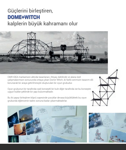 64G%u00fc%u00e7lerini birle%u015ftiren, DOME+WITCH kalplerin b%u00fcy%u00fck kahraman%u0131 olurCMR IDEA markam%u0131z%u0131n alt%u0131nda tasarlanan, ihtiya%u00e7 dahilinde ve alana %u00f6zel %u00e7al%u0131%u015fmalar%u0131m%u0131z%u0131n sonucunda ortaya %u00e7%u0131kan Dome-Witch, iki farkl%u0131 serimizin tasar%u0131m dili korunarak bir araya getirilmesiyle olu%u015fturulan bir oyun grubudur. Oyun grubunun bir taraf%u0131nda cad%u0131 konseptli bir kule di%u011fer taraf%u0131nda ise bu konsepte uygun kubbe %u015feklinde bir yap%u0131 bulunmaktad%u0131r. Bu iki yap%u0131y%u0131 birle%u015ftiren k%u00f6pr%u00fc sayesinde %u00e7ocuklar devasa b%u00fcy%u00fckl%u00fckteki bu oyun grubunda e%u011flencenin tad%u0131n%u0131 sonuna kadar %u00e7%u0131karmaktad%u0131rlar.DOME+WITCH