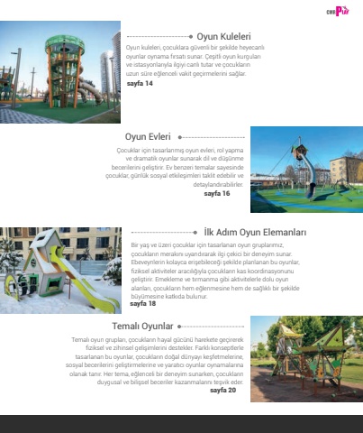 7Oyun kuleleri, %u00e7ocuklara g%u00fcvenli bir %u015fekilde heyecanl%u0131 oyunlar oynama f%u0131rsat%u0131 sunar. %u00c7e%u015fitli oyun kurgular%u0131 ve istasyonlar%u0131yla ilgiyi canl%u0131 tutar ve %u00e7ocuklar%u0131n uzun s%u00fcre e%u011flenceli vakit ge%u00e7irmelerini sa%u011flar.Oyun Kuleleri%u00c7ocuklar i%u00e7in tasarlanm%u0131%u015f oyun evleri, rol yapma ve dramatik oyunlar sunarak dil ve d%u00fc%u015f%u00fcnme becerilerini geli%u015ftirir. Ev benzeri temalar sayesinde %u00e7ocuklar, g%u00fcnl%u00fck sosyal etkile%u015fimleri taklit edebilir ve detayland%u0131rabilirler.Temal%u0131 oyun gruplar%u0131, %u00e7ocuklar%u0131n hayal g%u00fcc%u00fcn%u00fc harekete ge%u00e7irerek fiziksel ve zihinsel geli%u015fimlerini destekler. Farkl%u0131 konseptlerle tasarlanan bu oyunlar, %u00e7ocuklar%u0131n do%u011fal d%u00fcnyay%u0131 ke%u015ffetmelerine, sosyal becerilerini geli%u015ftirmelerine ve yarat%u0131c%u0131 oyunlar oynamalar%u0131na olanak tan%u0131r. Her tema, e%u011flenceli bir deneyim sunarken, %u00e7ocuklar%u0131n duygusal ve bili%u015fsel beceriler kazanmalar%u0131n%u0131 te%u015fvik eder.Oyun EvleriTemal%u0131 OyunlarBir ya%u015f ve %u00fczeri %u00e7ocuklar i%u00e7in tasarlanan oyun gruplar%u0131m%u0131z, %u00e7ocuklar%u0131n merak%u0131n%u0131 uyand%u0131rarak ilgi %u00e7ekici bir deneyim sunar. Ebeveynlerin kolayca eri%u015febilece%u011fi %u015fekilde planlanan bu oyunlar, fiziksel aktiviteler arac%u0131l%u0131%u011f%u0131yla %u00e7ocuklar%u0131n kas koordinasyonunu geli%u015ftirir. Emekleme ve t%u0131rmanma gibi aktivitelerle dolu oyun alanlar%u0131, %u00e7ocuklar%u0131n hem e%u011flenmesine hem de sa%u011fl%u0131kl%u0131 bir %u015fekilde b%u00fcy%u00fcmesine katk%u0131da bulunur.%u0130lk Ad%u0131m Oyun Elemanlar%u0131sayfa 14sayfa 16sayfa 18sayfa 20