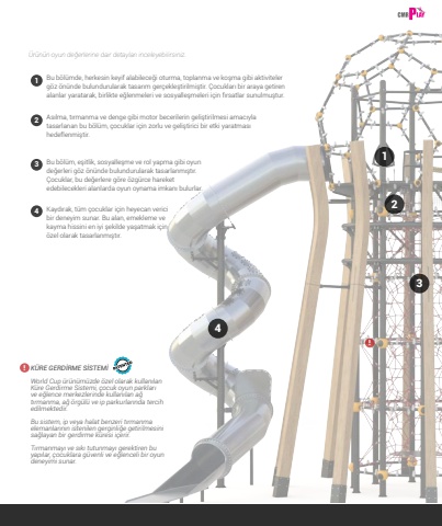 731234%u00dcr%u00fcn%u00fcn oyun de%u011ferlerine dair detaylar%u0131 inceleyebilirsiniz.Bu b%u00f6l%u00fcmde, herkesin keyif alabilece%u011fi oturma, toplanma ve ko%u015fma gibi aktiviteler g%u00f6z %u00f6n%u00fcnde bulundurularak tasar%u0131m ger%u00e7ekle%u015ftirilmi%u015ftir. %u00c7ocuklar%u0131 bir araya getiren alanlar yaratarak, birlikte e%u011flenmeleri ve sosyalle%u015fmeleri i%u00e7in f%u0131rsatlar sunulmu%u015ftur.As%u0131lma, t%u0131rmanma ve denge gibi motor becerilerin geli%u015ftirilmesi amac%u0131yla tasarlanan bu b%u00f6l%u00fcm, %u00e7ocuklar i%u00e7in zorlu ve geli%u015ftirici bir etki yaratmas%u0131 hedeflenmi%u015ftir.Kayd%u0131rak, t%u00fcm %u00e7ocuklar i%u00e7in heyecan verici bir deneyim sunar. Bu alan, emekleme ve kayma hissini en iyi %u015fekilde ya%u015fatmak i%u00e7in %u00f6zel olarak tasarlanm%u0131%u015ft%u0131r.Bu b%u00f6l%u00fcm, e%u015fitlik, sosyalle%u015fme ve rol yapma gibi oyun de%u011ferleri g%u00f6z %u00f6n%u00fcnde bulundurularak tasarlanm%u0131%u015ft%u0131r. %u00c7ocuklar, bu de%u011ferlere g%u00f6re %u00f6zg%u00fcrce hareket edebilecekleri alanlarda oyun oynama imkan%u0131 bulurlar.1234!!K%u00dcRE GERD%u0130RME S%u0130STEM%u0130World Cup %u00fcr%u00fcn%u00fcm%u00fczde %u00f6zel olarak kullan%u0131lan K%u00fcre Gerdirme Sistemi, %u00e7ocuk oyun parklar%u0131 ve e%u011flence merkezlerinde kullan%u0131lan a%u011f t%u0131rmanma, a%u011f %u00f6rg%u00fcl%u00fc ve ip parkurlar%u0131nda tercih edilmektedir. Bu sistem, ip veya halat benzeri t%u0131rmanma elemanlar%u0131n%u0131n istenilen gerginli%u011fe getirilmesini sa%u011flayan bir gerdirme k%u00fcresi i%u00e7erir. T%u0131rmanmay%u0131 ve s%u0131k%u0131 tutunmay%u0131 gerektiren bu yap%u0131lar, %u00e7ocuklara g%u00fcvenli ve e%u011flenceli bir oyun deneyimi sunar.