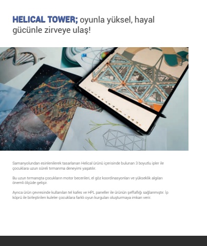 88Samanyolundan esinlenilerek tasarlanan Helical %u00fcr%u00fcn%u00fc i%u00e7erisinde bulunan 3 boyutlu ipler ile %u00e7ocuklara uzun s%u00fcreli t%u0131rmanma deneyimi ya%u015fat%u0131l%u0131r. Bu uzun t%u0131rman%u0131%u015fta %u00e7ocuklar%u0131n motor becerileri, el g%u00f6z koordinasyonlar%u0131 ve y%u00fckseklik alg%u0131lar%u0131 %u00f6nemli %u00f6l%u00e7%u00fcde geli%u015fir. Ayr%u0131ca %u00fcr%u00fcn %u00e7evresinde kullan%u0131lan tel kafes ve HPL paneller ile %u00fcr%u00fcn%u00fcn %u015feffafl%u0131%u011f%u0131 sa%u011flanm%u0131%u015ft%u0131r. %u0130p k%u00f6pr%u00fc ile birle%u015ftirilen kuleler %u00e7ocuklara farkl%u0131 oyun kurgular%u0131 olu%u015fturmaya imkan verir.HELICAL TOWER; oyunla y%u00fcksel, hayal g%u00fcc%u00fcnle zirveye ula%u015f!HELICAL TOWER;