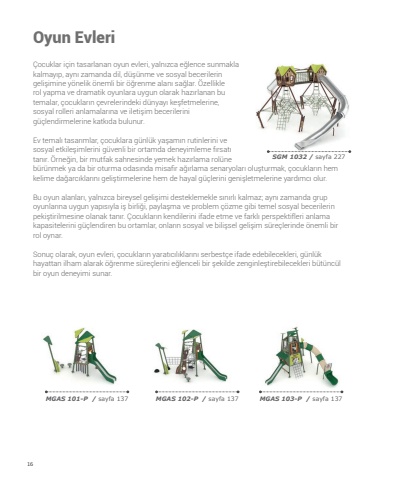 16%u00c7ocuklar i%u00e7in tasarlanan oyun evleri, yaln%u0131zca e%u011flence sunmakla kalmay%u0131p, ayn%u0131 zamanda dil, d%u00fc%u015f%u00fcnme ve sosyal becerilerin geli%u015fimine y%u00f6nelik %u00f6nemli bir %u00f6%u011frenme alan%u0131 sa%u011flar. %u00d6zellikle rol yapma ve dramatik oyunlara uygun olarak haz%u0131rlanan bu temalar, %u00e7ocuklar%u0131n %u00e7evrelerindeki d%u00fcnyay%u0131 ke%u015ffetmelerine, sosyal rolleri anlamalar%u0131na ve ileti%u015fim becerilerini g%u00fc%u00e7lendirmelerine katk%u0131da bulunur.Ev temal%u0131 tasar%u0131mlar, %u00e7ocuklara g%u00fcnl%u00fck ya%u015fam%u0131n rutinlerini ve sosyal etkile%u015fimlerini g%u00fcvenli bir ortamda deneyimleme f%u0131rsat%u0131 tan%u0131r. %u00d6rne%u011fin, bir mutfak sahnesinde yemek haz%u0131rlama rol%u00fcne b%u00fcr%u00fcnmek ya da bir oturma odas%u0131nda misafir a%u011f%u0131rlama senaryolar%u0131 olu%u015fturmak, %u00e7ocuklar%u0131n hem kelime da%u011farc%u0131klar%u0131n%u0131 geli%u015ftirmelerine hem de hayal g%u00fc%u00e7lerini geni%u015fletmelerine yard%u0131mc%u0131 olur.Bu oyun alanlar%u0131, yaln%u0131zca bireysel geli%u015fimi desteklemekle s%u0131n%u0131rl%u0131 kalmaz; ayn%u0131 zamanda grup oyunlar%u0131na uygun yap%u0131s%u0131yla i%u015f birli%u011fi, payla%u015fma ve problem %u00e7%u00f6zme gibi temel sosyal becerilerin peki%u015ftirilmesine olanak tan%u0131r. %u00c7ocuklar%u0131n kendilerini ifade etme ve farkl%u0131 perspektifleri anlama kapasitelerini g%u00fc%u00e7lendiren bu ortamlar, onlar%u0131n sosyal ve bili%u015fsel geli%u015fim s%u00fcre%u00e7lerinde %u00f6nemli bir rol oynar.Sonu%u00e7 olarak, oyun evleri, %u00e7ocuklar%u0131n yarat%u0131c%u0131l%u0131klar%u0131n%u0131 serbest%u00e7e ifade edebilecekleri, g%u00fcnl%u00fck hayattan ilham alarak %u00f6%u011frenme s%u00fcre%u00e7lerini e%u011flenceli bir %u015fekilde zenginle%u015ftirebilecekleri b%u00fct%u00fcnc%u00fcl bir oyun deneyimi sunar.MGAS 101-P / sayfa 137MGAS 102-P / sayfa 137MGAS 103-P / sayfa 137Oyun EvleriSGM 1032 / sayfa 227