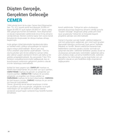 28Kendi sekt%u00f6r%u00fcnde, T%u00fcrkiye%u2019nin ad%u0131n%u0131 uluslararas%u0131 arenada duyurmay%u0131 ba%u015farm%u0131%u015f olman%u0131n verdi%u011fi gururla %u201cD%u00fc%u015ften Ger%u00e7e%u011fe%u201d slogan%u0131yla %u00e7%u0131kt%u0131%u011f%u0131 yolda yeni nesil oyun gruplar%u0131yla T%u00fcrkiye%u2019de ve D%u00fcnyada ba%u015far%u0131l%u0131 projelerle ad%u0131ndan s%u00f6z ettirmektedir. Cemer%u2019in bundan sonraki hedefi; sekt%u00f6rel de%u011fi%u015fimin %u00e7ok h%u0131zl%u0131 geli%u015fmesini sa%u011flamak, yeni nesil oyun gruplar%u0131 alan%u0131ndaki liderli%u011fini s%u00fcrd%u00fcrmek, fiyat yerine %u201cKalitede Rekabet ve Yenilik%u201d ilkesini sekt%u00f6r%u00fcne kazand%u0131rmak, beklentilerin %u00fczerinde yarat%u0131c%u0131 %u00fcr%u00fcnler sunmak i%u00e7in %u00e7al%u0131%u015fmak olacakt%u0131r. Sekt%u00f6rde farkl%u0131l%u0131klar yarat%u0131p ulusal ve uluslararas%u0131 arenada kal%u0131c%u0131 %u00fcst%u00fcnl%u00fckler sa%u011flamak ad%u0131na yeni ufuklara do%u011fru yol alma hedeflerimizde, sizlerden alaca%u011f%u0131m%u0131z her t%u00fcrl%u00fc ele%u015ftiri ya da %u00f6vg%u00fc bizler i%u00e7in yol g%u00f6sterici olacak ve yeni hedeflere do%u011fru ko%u015fmam%u0131z%u0131 sa%u011flayacakt%u0131r.1994 y%u0131l%u0131nda %u0130zmir%u2019de kurulan Cemer Kent Ekipmanlar%u0131 San. Tic. A.%u015e. %u00e7eyrek as%u0131rl%u0131k tecr%u00fcbesiyle 25.000 m%u00b2 kapal%u0131 30.000 m%u00b2 a%u00e7%u0131k toplam 55.000 m%u00b2 alana sahip 300 %u00e7al%u0131%u015fan%u0131yla hizmet vermektedir. Kent ekipmanlar%u0131 ve donat%u0131 malzemeleri sekt%u00f6r%u00fcnde %u00f6nc%u00fc firma olman%u0131n verdi%u011fi bilin%u00e7le, fikirden %u00fcretime kadar t%u00fcm s%u00fcreci kendi b%u00fcnyesinde olu%u015fturarak, bir d%u00fcnya markas%u0131 olmay%u0131 ba%u015farm%u0131%u015ft%u0131r. H%u0131zla geli%u015fen dijital teknolojiler beraberinde daha az hareket eden, gittik%u00e7e asosyalle%u015fen bir toplum yap%u0131s%u0131 ortaya %u00e7%u0131karmaktad%u0131r. Bunun yan%u0131 s%u0131ra n%u00fcfus artarken ye%u015fil alanlar azalmaktad%u0131r. T%u00fcm bu olumsuzluklar%u0131 g%u00f6z %u00f6n%u00fcne ald%u0131%u011f%u0131m%u0131z zaman nefes alan ald%u0131ran ya%u015fam alanlar%u0131n%u0131n %u00f6nemi %u00e7ok daha iyi bir %u015fekilde anla%u015f%u0131labilmektedir. Bu %u00e7er%u00e7evede 7%u2019den 70%u2019e herkesin sosyalle%u015fmesine katk%u0131 sa%u011flayacak, kas ve koordinasyon sisteminin geli%u015fimine yard%u0131mc%u0131 olacak %u00fcr%u00fcnler tasarlay%u0131p %u00fcretmektedir. Kaliteli bir kent ya%u015fam%u0131 i%u00e7in; CMRPLAY markas%u0131 ve Parkfit Kent Ekipmanlar%u0131 ile %u00e7ocuklar i%u00e7in oyun parklar%u0131, CMRXTREME markas%u0131 ile gen%u00e7ler ve yeti%u015fkinler i%u00e7in macera parklar%u0131, CMRACTIVE markas%u0131 ile %u00e7ocuklar, yeti%u015fkinler ve engelliler i%u00e7in fitness aletleri ve CMRURBAN markas%u0131 ile de kent ekipmanlar%u0131, CMRIDEAile %u00f6zel tasar%u0131m %u00fcr%u00fcnler, CMRHIC markas%u0131 ile yer zemin i%u00e7in kau%u00e7uk %u00fcretmektedir. Cemer; g%u00fcvenli%u011fi temel alarak tasarlanan %u00fcr%u00fcnler ile %u00e7ocuklar%u0131n yan%u0131 s%u0131ra gen%u00e7ler, yeti%u015fkinler ve engelli vatanda%u015flar i%u00e7in de e%u011flenceli ve sa%u011fl%u0131kl%u0131 alanlar yaratarak sosyal hayat%u0131 canland%u0131rmay%u0131 hedefle hareket etmektedir. D%u00fc%u015ften Ger%u00e7e%u011fe, Ger%u00e7ekten Gelece%u011fe CEMER