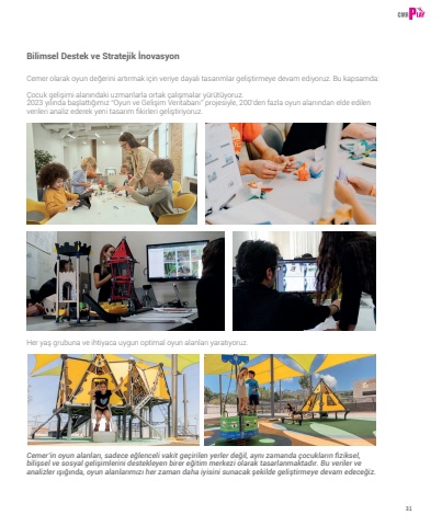 31Bilimsel Destek ve Stratejik %u0130novasyonCemer olarak oyun de%u011ferini art%u0131rmak i%u00e7in veriye dayal%u0131 tasar%u0131mlar geli%u015ftirmeye devam ediyoruz. Bu kapsamda:%u00c7ocuk geli%u015fimi alan%u0131ndaki uzmanlarla ortak %u00e7al%u0131%u015fmalar y%u00fcr%u00fct%u00fcyoruz.2023 y%u0131l%u0131nda ba%u015flatt%u0131%u011f%u0131m%u0131z %u201cOyun ve Geli%u015fim Veritaban%u0131%u201d projesiyle, 200%u2019den fazla oyun alan%u0131ndan elde edilen verileri analiz ederek yeni tasar%u0131m fikirleri geli%u015ftiriyoruz.Cemer%u2019in oyun alanlar%u0131, sadece e%u011flenceli vakit ge%u00e7irilen yerler de%u011fil, ayn%u0131 zamanda %u00e7ocuklar%u0131n fiziksel, bili%u015fsel ve sosyal geli%u015fimlerini destekleyen birer e%u011fitim merkezi olarak tasarlanmaktad%u0131r. Bu veriler ve analizler %u0131%u015f%u0131%u011f%u0131nda, oyun alanlar%u0131m%u0131z%u0131 her zaman daha iyisini sunacak %u015fekilde geli%u015ftirmeye devam edece%u011fiz.Her ya%u015f grubuna ve ihtiyaca uygun optimal oyun alanlar%u0131 yarat%u0131yoruz.