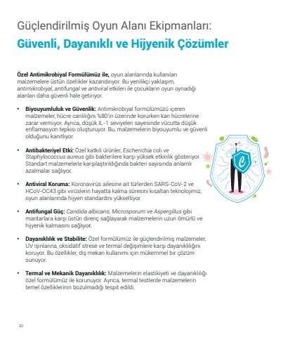 32G%u00fc%u00e7lendirilmi%u015f Oyun Alan%u0131 Ekipmanlar%u0131: G%u00fcvenli, Dayan%u0131kl%u0131 ve Hijyenik %u00c7%u00f6z%u00fcmler %u00d6zel Antimikrobiyal Form%u00fcl%u00fcm%u00fcz ile, oyun alanlar%u0131nda kullan%u0131lan malzemelere %u00fcst%u00fcn %u00f6zellikler kazand%u0131r%u0131yor. Bu yenilik%u00e7i yakla%u015f%u0131m, antimikrobiyal, antifungal ve antiviral etkileri ile %u00e7ocuklar%u0131n oyun oynad%u0131%u011f%u0131 alanlar%u0131 daha g%u00fcvenli hale getiriyor. %u2022Biyouyumluluk ve G%u00fcvenlik: Antimikrobiyal form%u00fcl%u00fcm%u00fcz%u00fc i%u00e7eren malzemeler, h%u00fccre canl%u0131l%u0131%u011f%u0131n%u0131 %80%u2019in %u00fczerinde korurken kan h%u00fccrelerine zarar vermiyor. Ayr%u0131ca, d%u00fc%u015f%u00fck IL-1 seviyeleri sayesinde v%u00fccutta d%u00fc%u015f%u00fck enflamasyon tepkisi olu%u015fturuyor. Bu, malzemelerin biyouyumlu ve g%u00fcvenli oldu%u011funu kan%u0131tl%u0131yor.%u2022Antibakteriyel Etki: %u00d6zel katk%u0131l%u0131 %u00fcr%u00fcnler, Escherichia coli ve Staphylococcus aureus gibi bakterilere kar%u015f%u0131 y%u00fcksek etkinlik g%u00f6steriyor. Standart malzemelerle kar%u015f%u0131la%u015ft%u0131r%u0131ld%u0131%u011f%u0131nda bakteri say%u0131s%u0131nda anlaml%u0131 azalmalar sa%u011fl%u0131yor.%u2022Antiviral Koruma: Koronavir%u00fcs ailesine ait t%u00fcrlerden SARS-CoV-2 ve HCoV-OC43 gibi vir%u00fcslerin hayatta kalma s%u00fcresini k%u0131saltan teknolojimiz, oyun alanlar%u0131nda hijyen standard%u0131n%u0131 y%u00fckseltiyor.%u2022Antifungal G%u00fc%u00e7: Candida albicans, Microsporum ve Aspergillus gibi mantarlara kar%u015f%u0131 %u00fcst%u00fcn diren%u00e7 sa%u011flayarak malzemelerin uzun %u00f6m%u00fcrl%u00fc ve hijyenik kalmas%u0131n%u0131 sa%u011fl%u0131yor.%u2022Dayan%u0131kl%u0131l%u0131k ve Stabilite: %u00d6zel form%u00fcl%u00fcm%u00fcz ile g%u00fc%u00e7lendirilmi%u015f malzemeler, UV %u0131%u015f%u0131nlar%u0131na, oksidatif strese ve termal de%u011fi%u015fimlere kar%u015f%u0131 dayan%u0131kl%u0131l%u0131%u011f%u0131n%u0131 koruyor. Bu %u00f6zellikler, d%u0131%u015f mekan kullan%u0131m%u0131 i%u00e7in m%u00fckemmel bir %u00e7%u00f6z%u00fcm sunuyor.%u2022Termal ve Mekanik Dayan%u0131kl%u0131l%u0131k: Malzemelerin elastikiyeti ve dayan%u0131kl%u0131l%u0131%u011f%u0131 %u00f6zel form%u00fcl%u00fcm%u00fcz ile korunuyor. Ayr%u0131ca, termal testlerde malzemelerin temel %u00f6zelliklerinin bozulmad%u0131%u011f%u0131 tespit edildi.