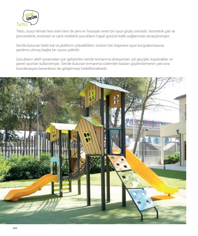 330Tetto, soyut temal%u0131 hem eski hem de yeni ev hissiyat%u0131 veren bir oyun grubu serisidir. Asimetrik %u00e7at%u0131 ve pencerelerle, kontrast ve canl%u0131 renklerle %u00e7ocuklar%u0131n hayal g%u00fcc%u00fcne katk%u0131 sa%u011flanmas%u0131 ama%u00e7lanm%u0131%u015ft%u0131r. Seride bulunan farkl%u0131 kat ve platform y%u00fckseklikleri, %u00fcr%u00fcn%u00fcn her k%u00f6%u015fesine oyun kurgulanmas%u0131na yard%u0131mc%u0131 olmu%u015f ba%u015fka bir oyunu %u015feklidir. %u00c7ocuklar%u0131n aktif oynamalar%u0131 i%u00e7in geli%u015ftirilen seride t%u0131rmanma istasyonlar%u0131, ipli ge%u00e7i%u015fler, kayd%u0131raklar ve panel oyunlar%u0131 kullan%u0131lm%u0131%u015ft%u0131r. Seride bulunan t%u0131rmanma sistemleri kaslar%u0131 g%u00fc%u00e7lendirmenin yan%u0131 s%u0131ra koordinasyon becerilerini de geli%u015ftirmeyi hedeflemektedir. Tetto%u00dcR%u00dcN