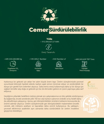 34Karbonsuz bir gelecek i%u00e7in at%u0131lan her ad%u0131m b%u00fcy%u00fck %u00f6nem ta%u015f%u0131r. %u00dcretim s%u00fcre%u00e7lerimizde %u00e7evresel sorumluluk bilinciyle hareket ederek, karbon ayak izimizi minimize ediyor ve s%u00fcrd%u00fcr%u00fclebilir bir d%u00fcnya i%u00e7in gerekli t%u00fcm %u00f6nlemleri al%u0131yoruz. Daha temiz enerji kullan%u0131m%u0131yla daha iyi bir d%u00fcnya i%u00e7in sa%u011flam temeller at%u0131p do%u011fa ve gelecek i%u00e7in biz de elimizden gelenin en iyisini yapmaya %u00e7aba sarf ediyoruz. Ge%u00e7ti%u011fimiz y%u0131llardaki hedeflerin %u00fcst%u00fcne %u00e7%u0131kmak i%u00e7in %u00e7al%u0131%u015fmalar%u0131m%u0131z%u0131 en titiz %u015fekilde s%u00fcrd%u00fcr%u00fcyoruz. Bu ba%u011flamda, %u00f6nceki senelerde y%u0131ll%u0131k 700 ton olan karbon sal%u0131n%u0131m%u0131n%u0131 %u00f6nledik ve bu hedefi daha da y%u00fckseltmeye %u00e7al%u0131%u015f%u0131yoruz. Ayr%u0131ca, geri d%u00f6n%u00fc%u015ft%u00fcr%u00fclebilen %u00fcr%u00fcnlerin kullan%u0131m%u0131 konusunda da %u00f6nemli ad%u0131mlar at%u0131yoruz. %u00dcretim s%u00fcre%u00e7lerimizde geri d%u00f6n%u00fc%u015ft%u00fcr%u00fclebilir malzemelere %u00f6ncelik vererek, at%u0131k miktar%u0131n%u0131 azalt%u0131yor ve kaynaklar%u0131 daha verimli kullan%u0131yoruz. Bu yakla%u015f%u0131m, %u00e7evresel etkilerimizi azalt%u0131rken ayn%u0131 zamanda daha s%u00fcrd%u00fcr%u00fclebilir bir %u00fcretim modeline ge%u00e7i%u015fimizi destekliyor. Cemer~ 912.096.827,27 kWh~449.243.638.880 kg ~109.305,0 Number~532 Number of~449.243.639 TEP TonsS%u00fcrd%u00fcr%u00fclebilirlikY%u0131ldaEnerji TasarrufuEngellenen CO2EmisyonuKurtar%u0131lanA%u011fa%u00e7Hane Say%u0131s%u0131E%u015fDe%u011ferPetrol Kar%u015f%u0131l%u0131%u011f%u0131