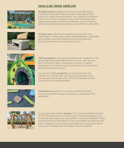 37EKOLOJ%u0130K %u00dcR%u00dcN SER%u0130LER%u0130Kompozit kaplama; a%u011fa%u00e7lar%u0131n kesilmesi yoluyla de%u011fil, ah%u015fap hurdalardan elde edilen tala%u015flar ile %u00fcretilir. Ah%u015fap g%u00f6r%u00fcn%u00fcm%u00fcne sahip %u00fcr%u00fcn, y%u00fcksek dayan%u0131ma sahiptir. %u00dcr%u00fcn; ah%u015fab%u0131n d%u0131%u015f mekanda kullan%u0131m%u0131 sonucunda, malzemenin su ve nem ile etkile%u015fiminden do%u011fan dezavantajlar%u0131 (yosunlanma, k%u00fcflenme, %u00e7%u00fcr%u00fcme ve yanma gibi) ortadan kald%u0131rarak do%u011fal ah%u015fap i%u00e7in %u00e7ok %u00f6nemli bir alternatiftir.HDPE panellerimiz, okyanuslardan toplanan at%u0131k maddelerin %100 geri d%u00f6n%u00fc%u015ft%u00fcr%u00fclmesiyle %u00fcretilmektedir. Bizim i%u00e7in %u201cat%u0131k%u201d kelimesi, art%u0131k %u201cistenmeyen%u201d yerine, malzemelerin sorumlu bir %u015fekilde tedarik edilmesi ve daha iyi bir d%u00fcnya yaratmak i%u00e7in yeni f%u0131rsatlar%u0131n ke%u015ffedilmesi anlam%u0131na geliyor. Ayn%u0131 zamanda, HPL panellerimiz de dahil olmak %u00fczere t%u00fcm panellerimiz, UV %u0131%u015f%u0131nlar%u0131 gibi zorlu d%u0131%u015f mekan ko%u015fullar%u0131na kar%u015f%u0131 y%u00fcksek dayan%u0131kl%u0131l%u0131k g%u00f6stermekte ve PFEC sertifikas%u0131yla %u00e7evresel sorumlulu%u011fumuzu belgelemektedir3D beton yaz%u0131c%u0131, dijital bas%u0131m y%u00f6ntemi yoluyla %u00e7imento bazl%u0131 malzemelerin %u00fcretimini yapmaktad%u0131r. S%u00fcrd%u00fcr%u00fclebilirlik ve dayan%u0131kl%u0131l%u0131k gibi avantajlar%u0131 sayesinde olduk%u00e7a %u00f6nemli olan bu teknoloji, kentlerin %u00e7evre dostu olmas%u0131na katk%u0131da bulunur.Platformlar%u0131m%u0131z kaymaz ve su ge%u00e7irmez %u00f6zelliklere sahiptir. S%u0131cak pres fenolik film kaplama uygulanan bu platformlar PFEC sertifikal%u0131d%u0131r.Oyun gruplar%u0131nda kullan%u0131lan ah%u015faplar, FSC (Forest Stewardship Council) ve PEFC (Programme for the Endorsement of Forest Certification) gibi uluslararas%u0131 ge%u00e7erlili%u011fe sahip s%u00fcrd%u00fcr%u00fclebilir ormanc%u0131l%u0131k sertifikalar%u0131na sahip kaynaklardan temin edilmektedir.Cemer, s%u00fcrd%u00fcr%u00fclebilir kaynaklardan elde edilen ah%u015faplarla, hem %u00e7ocuklar%u0131n g%u00fcvenli%u011fini hem de do%u011fal kaynaklar%u0131n korunmas%u0131n%u0131 %u00f6nceliklendiren bir yakla%u015f%u0131m%u0131 benimsemektedir.
