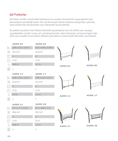 3703,95 x 0,5 x 3,0 m3,95 x 0,4 x 3,0 m3,7 x 1,7 x 2,6 m4,0 x 0,40 x 2,95 m3,95 x 0,4 x 2,6 m4,1 x 0,85 x 3 m22,3 m%u00b221,8 m%u00b229,6 m%u00b221,8 m%u00b221,4 m%u00b225,3 m%u00b23333323-123-123-123-123-125-120,65 m1110,5 m0,65 m1,3 m1111,1 m1,1 mAGMS 04AGMS 14AGMS 21AGMS 04AGMS 14AGMS 21AGMS 05AGMS 17AGMS 28AGMS 05AGMS 17AGMS 28%u0130pli Parkur %u00fcr%u00fcnleri, bir%u00e7ok farkl%u0131 fonksiyonun ip oyunlar%u0131 temelinde bir araya gelerek oyun elemanlar%u0131na yans%u0131t%u0131ld%u0131%u011f%u0131 seridir. Seri i%u00e7inde bireysel olarak kullan%u0131lan istasyonlar%u0131n yan%u0131nda, %u00e7oklu kullan%u0131mlar%u0131 da bar%u0131nd%u0131ran oyun elemanlar%u0131 bulunmaktad%u0131r. Bu %u015fekilde %u00e7ocuklar%u0131n hem fiziksel aktiviteler ger%u00e7ekle%u015ftirip hem de birlikte oyun oynay%u0131p sosyalle%u015ftikleri %u00fcr%u00fcnler sunan seri; ipli denge birimleri, ad%u0131m elemanlar%u0131, t%u0131rmanma %u00f6geleri gibi farkl%u0131 oyun %u00e7e%u015fitleri ile %u00e7ocuklar%u0131n dikkatini %u00e7ekmekte ve onlara keyifli aktiviteler sunmaktad%u0131r.%u0130pli Parkurlar