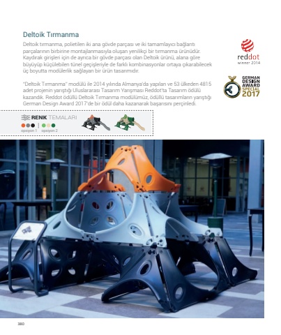 380Deltoik t%u0131rmanma, polietilen iki ana g%u00f6vde par%u00e7as%u0131 ve iki tamamlay%u0131c%u0131 ba%u011flant%u0131 par%u00e7alar%u0131n%u0131n birbirine montajlanmas%u0131yla olu%u015fan yenilik%u00e7i bir t%u0131rmanma %u00fcr%u00fcn%u00fcd%u00fcr. Kayd%u0131rak giri%u015fleri i%u00e7in de ayr%u0131ca bir g%u00f6vde par%u00e7as%u0131 olan Deltoik %u00fcr%u00fcn%u00fc, alana g%u00f6re b%u00fcy%u00fcy%u00fcp k%u00fc%u00e7%u00fclebilen t%u00fcnel ge%u00e7i%u015fleriyle de farkl%u0131 kombinasyonlar ortaya %u00e7%u0131karabilecek %u00fc%u00e7 boyutta mod%u00fclerlik sa%u011flayan bir %u00fcr%u00fcn tasar%u0131m%u0131d%u0131r. %u201cDeltoik T%u0131rmanma%u2019%u2019 mod%u00fcl%u00fc ile 2014 y%u0131l%u0131nda Almanya%u2019da yap%u0131lan ve 53 %u00fclkeden 4815 adet projenin yar%u0131%u015ft%u0131%u011f%u0131 Uluslararas%u0131 Tasar%u0131m Yar%u0131%u015fmas%u0131 Reddot%u2019ta Tasar%u0131m %u00f6d%u00fcl%u00fc kazand%u0131k. Reddot %u00f6d%u00fcll%u00fc Deltoik T%u0131rmanma mod%u00fcl%u00fcm%u00fcz, %u00f6d%u00fcll%u00fc tasar%u0131mlar%u0131n yar%u0131%u015ft%u0131%u011f%u0131 German Design Award 2017%u2019de bir %u00f6d%u00fcl daha kazanarak ba%u015far%u0131s%u0131n%u0131 per%u00e7inledi.Deltoik T%u0131rmanmaRENK TEMALARIopsiyon 1opsiyon 2