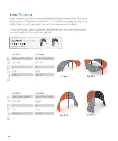 384Burgu t%u0131rmanma, %u00e7ocuklar%u0131n t%u0131rmanma becerilerini geli%u015ftirmeye y%u00f6nelik tasarlanan dalgal%u0131 ve d%u00fcz iki formu bulunan mod%u00fcler bir %u00fcr%u00fcnd%u00fcr. %u00dcr%u00fcn%u00fcn yatay ve dikey olarak farkl%u0131 kullan%u0131m %u00e7e%u015fitleri sayesinde say%u0131s%u0131z kombinasyonlar olu%u015fturulabilir. Formunun engebeli olmas%u0131 sayesinde %u00e7ocuklar%u0131n denge ve koordinasyonunu ayn%u0131 zamanda mek%u00e2nsal fark%u0131ndal%u0131klar%u0131n%u0131 geli%u015ftirir.Burgu T%u0131rmanma4,85 x 1,45 x 1,55 m3,25 x 1,0 x 2,40 m5,2 x 3,3 x 1,25 m3,25 x 2,85 x 2,40 m26,3 m%u00b223,5 m%u00b240,7 m%u00b228 m%u00b244863-123-123-123-121,55 m12,40 m11,25 m12,40 m1CA 802CA 813CA 802CA 813CA 810CA 814CA 810CA 814RENK TEMALARIopsiyon 1opsiyon 2