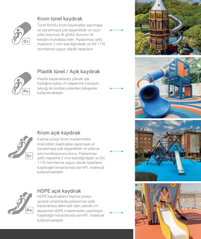 39CrKrom t%u00fcnel kayd%u0131rakPlastik t%u00fcnel / A%u00e7%u0131k kayd%u0131rakKrom a%u00e7%u0131k kayd%u0131rakHDPE a%u00e7%u0131k kayd%u0131rakT%u00fcnel formlu krom kayd%u0131raklar a%u015f%u0131nmaya ve y%u0131pranmaya %u00e7ok dayan%u0131kl%u0131d%u0131r ve uzun y%u0131llar boyunca ilk g%u00fcnk%u00fc durumu ile kendini muhafaza eder. Paslanmaz %u00e7elik malzeme 2 mm kal%u0131nl%u0131%u011f%u0131ndad%u0131r ve EN 1176 normlar%u0131na uygun olarak tasarlan%u0131r. Plastik kayd%u0131raklarda y%u00fcksek %u0131%u015f%u0131k hasl%u0131%u011f%u0131na sahip UV dayan%u0131ml%u0131 rotasyon tekni%u011fi ile %u00fcretilen polietilen bile%u015fenler kullan%u0131lmaktad%u0131r. Kayma y%u00fczeyi krom malzemeden imal edilen kayd%u0131raklar a%u015f%u0131nmaya ve y%u0131pranmaya %u00e7ok dayan%u0131kl%u0131d%u0131r ve y%u0131llarca yeni kondisyonunu korur. Paslanmaz %u00e7elik malzeme 2 mm kal%u0131nl%u0131%u011f%u0131ndad%u0131r ve EN 1176 normlar%u0131na uygun olarak tasarlan%u0131r. Kayd%u0131ra%u011f%u0131n kenarlar%u0131nda ise HPL materyal kullan%u0131lmaktad%u0131r.HDPE kayd%u0131raklar%u0131n kayma y%u00fczeyi, g%u00fcne%u015fli ortamlarda paslanmaz %u00e7elik kayd%u0131raklara alternatif olan y%u00fcksek UV dayan%u0131ml%u0131 HDPE malzemeden yap%u0131lm%u0131%u015ft%u0131r.Kayd%u0131ra%u011f%u0131n kenarlar%u0131nda ise HPL materyal kullan%u0131lmaktad%u0131r.PePeCr