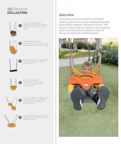 3963-12 ya%u015f aras%u0131na uygun sal%u0131ncaklar s%u00f6n%u00fcmleme %u00f6zelli%u011fi sayesinde g%u00fcvenli bir kullan%u0131m sa%u011flar.%u00d6zel ihtiya%u00e7l%u0131 %u00e7ocuklar%u0131n kullan%u0131m%u0131na ve g%u00fcvenli%u011fine uygun olarak tasarlanm%u0131%u015f sal%u0131ncaklard%u0131r.5+ ya%u015f kullan%u0131m%u0131na uygun olarak kau%u00e7uk malzemeden %u00fcretilen sal%u0131ncaklard%u0131r.Grup kullan%u0131m%u0131na uygun olan bu sal%u0131ncak 360 derece s%u00f6n%u00fcmleme %u00f6zelli%u011fine sahiptir.6-36 ayl%u0131k bebeklerin ebeveynleri ile kullan%u0131m%u0131na ve g%u00fcvenli%u011fine uygun olarak tasarlanm%u0131%u015f sal%u0131ncaklard%u0131r. 6-36 ayl%u0131k bebeklerin kullan%u0131m%u0131na ve g%u00fcvenli%u011fine uygun olarak tasarlanm%u0131%u015f sal%u0131ncaklard%u0131r. %u00dcR%u00dcNLER%u0130 %u00d6ZELLE%u015eT%u0130R%u0130NSal%u0131ncaklar, %u00e7ocuklar%u0131n yer%u00e7ekimi ve perspektif alg%u0131lar%u0131n%u0131 geli%u015ftiren k%u00fc%u00e7%u00fck ya%u015fta mek%u00e2nsal fark%u0131ndal%u0131k kazanmalar%u0131n%u0131 sa%u011flayan sallanma birimleridir. Tekil kullan%u0131m, birlikte kullan%u0131m, engelli i%u00e7in %u00f6zel tasarlanan sallanma birimleriyle t%u00fcm %u00e7ocuklar%u0131n sallanma deneyimini ke%u015ffetmesi hedeflenmektedir.Sal%u0131ncaklar123456