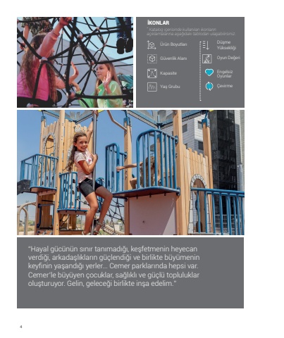 4%u201cHayal g%u00fcc%u00fcn%u00fcn s%u0131n%u0131r tan%u0131mad%u0131%u011f%u0131, ke%u015ffetmenin heyecan verdi%u011fi, arkada%u015fl%u0131klar%u0131n g%u00fc%u00e7lendi%u011fi ve birlikte b%u00fcy%u00fcmenin keyfinin ya%u015fand%u0131%u011f%u0131 yerler... Cemer parklar%u0131nda hepsi var. Cemer%u2019le b%u00fcy%u00fcyen %u00e7ocuklar, sa%u011fl%u0131kl%u0131 ve g%u00fc%u00e7l%u00fc topluluklar olu%u015fturuyor. Gelin, gelece%u011fi birlikte in%u015fa edelim.%u201d%u00dcr%u00fcn Boyutlar%u0131 Engelsiz Oyunlar%u0130KONLAR* Katalog i%u00e7erisinde kullan%u0131lan ikonlar%u0131n a%u00e7%u0131klamalar%u0131na a%u015fa%u011f%u0131daki tablodan ula%u015fabilirsiniz.G%u00fcvenlik Alan%u0131%u00c7evirmeKapasiteYa%u015f GrubuD%u00fc%u015fme Y%u00fcksekli%u011fiOyun De%u011feri
