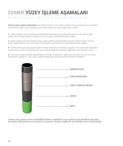 40CEMERY%u00dcZEY %u0130%u015eLEME A%u015eAMALARICemer y%u00fczey i%u015fleme teknolojisi, kent ekipmanlar%u0131n%u0131 zorlu d%u0131%u015f ko%u015fullara kar%u015f%u0131 koruyarak uzun %u00f6m%u00fcrl%u00fc dayan%u0131kl%u0131l%u0131k sa%u011flar ve uluslararas%u0131 %u00e7evre standartlar%u0131na uygunlu%u011fu garanti eder.Cemer y%u00fczey i%u015fleme s%u00fcreci, dayan%u0131kl%u0131l%u0131k, kalite ve esteti%u011fi bir araya getiren %u00f6zel tekniklerle %u00f6ne %u00e7%u0131kar. Her detay, ekipmanlar%u0131n uzun %u00f6m%u00fcrl%u00fc ve g%u00fcvenilir olmas%u0131n%u0131 sa%u011flamak i%u00e7in titizlikle kontrol edilmektedir.KARBON %u00c7EL%u0130KKUM P%u00dcSK%u00dcRTMEY%u00dcZEY TEM%u0130ZL%u0130K %u0130%u015eLEM%u0130ASTARBOYA1- %u00c7elik y%u00fczeyler, kum p%u00fcsk%u00fcrtme y%u00f6ntemiyle temizlenip p%u00fcr%u00fczlendirilerek temel bir i%u015fleme tabi tutulur. Bu, y%u00fczeyin boya ve kaplama i%u00e7in en uygun hale getirilmesini sa%u011flar.2- Astar uygulamas%u0131 %u00f6ncesinde y%u00fczey, ya%u011f ve kirden ar%u0131nd%u0131r%u0131larak korozyon direnci art%u0131r%u0131l%u0131r. Bu %u00f6n i%u015flem, ekipmanlar%u0131n uzun s%u00fcre boyunca ilk g%u00fcnk%u00fc performans%u0131n%u0131 korumas%u0131na katk%u0131 sa%u011flar.3- %u00d6n i%u015flemden ge%u00e7mi%u015f y%u00fczeye, %u00f6zel bir astar katman%u0131 ve toz boya uygulan%u0131r. Bu a%u015famada kullan%u0131lan malzemeler, %u00fcretici standartlar%u0131na uygun olarak ideal film kal%u0131nl%u0131%u011f%u0131 sa%u011flamak %u00fczere %u00f6zenle se%u00e7ilir.4- Son olarak, ekipmanlara dayan%u0131kl%u0131l%u0131%u011f%u0131 art%u0131rmak ve estetik bir g%u00f6r%u00fcn%u00fcm kazand%u0131rmak i%u00e7in ek boya katmanlar%u0131 uygulan%u0131r. T%u00fcm s%u00fcre%u00e7, kalite standartlar%u0131 do%u011frultusunda titizlikle denetlenir.Dayan%u0131kl%u0131l%u0131%u011f%u0131n Estetikle Bulu%u015ftu%u011fu Nokta