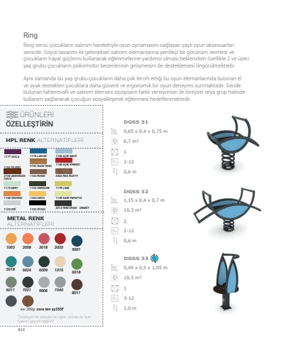 4100,65 x 0,4 x 0,75 m1,15 x 0,4 x 0,7 m0,45 x 0,5 x 1,05 m6,7 m%u00b210,3 m%u00b210,3 m%u00b21212-122-123-120,6 m0,6 m1,0 mDGSS 31DGSS 32DGSS 33Ring serisi, %u00e7ocuklar%u0131n sal%u0131n%u0131m hareketiyle oyun oynamas%u0131n%u0131 sa%u011flayan yayl%u0131 oyun aksesuarlar%u0131 serisidir. Soyut tasar%u0131m%u0131 ile geleneksel sal%u0131n%u0131m elemanlar%u0131na yenilik%u00e7i bir g%u00f6r%u00fcn%u00fcm vermesi ve %u00e7ocuklar%u0131n hayal g%u00fc%u00e7lerini kullanarak e%u011flenmelerine yard%u0131mc%u0131 olmas%u0131 beklenirken %u00f6zellikle 2 ve %u00fczeri ya%u015f grubu %u00e7ocuklar%u0131n psikomotor becerilerinin geli%u015fmesini de desteklemesi %u00f6ng%u00f6r%u00fclmektedir. Ayn%u0131 zamanda bu ya%u015f grubu %u00e7ocuklar%u0131n daha %u00e7ok tercih etti%u011fi bu oyun elemanlar%u0131nda bulunan el ve ayak destekleri %u00e7ocuklara daha g%u00fcvenli ve ergonomik bir oyun deneyimi sunmaktad%u0131r. Seride bulunan tahterevalli ve sal%u0131n%u0131m eleman%u0131 z%u0131pz%u0131plar%u0131n farkl%u0131 versiyonlar%u0131 ile bireysel veya grup halinde kullan%u0131m sa%u011flanarak %u00e7ocu%u011fun sosyalle%u015ferek e%u011flenmesi hedeflenmektedirRingsw 306gcore ten xy355f*%u00d6zelle%u015ftirme taleplerine ili%u015fkin %u00fcr%u00fcnlerde liste fiyatlar%u0131 ge%u00e7erli de%u011fildir. %u00dcR%u00dcNLER%u0130 %u00d6ZELLE%u015eT%u0130R%u0130NHPL RENK ALTERNAT%u0130FLER%u0130METAL RENK ALTERNAT%u0130FLER%u01301003 200830183020500150187021502490066009 101560186011704080111177 VIOLA1152 F%u0130LD%u0130%u015e%u01301173 MINT1138 ORANGE1123 GR%u01302728 AMER%u0130KAN CEV%u0130Z1176 LAGUN2742 SIAM TEAK1154 VERDURE1160 ARCH1102 S%u0130YAH1164 ROME1105 A%u00c7IK MAV%u01301146 A%u00c7IK KIRMIZI1179 LIME1129 SARI PAPATYA3314 YEN%u0130 S%u0130YAH GRAN%u0130T3464 RED RUSTY