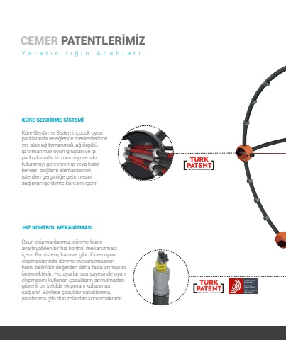 42K%u00dcRE GERD%u0130RME S%u0130STEM%u0130K%u00fcre Gerdirme Sistemi, %u00e7ocuk oyun parklar%u0131nda ve e%u011flence merkezlerinde yer alan a%u011f t%u0131rmanmal%u0131, a%u011f %u00f6rg%u00fcl%u00fc, ip t%u0131rmanmal%u0131 oyun gruplar%u0131 ve ip parkurlar%u0131nda, t%u0131rmanmay%u0131 ve s%u0131k%u0131 tutunmay%u0131 gerektiren ip veya halat benzeri ba%u011flant%u0131 elemanlar%u0131n%u0131n istenilen gerginli%u011fe getirmesini sa%u011flayan gerdirme k%u00fcresini i%u00e7erir.Oyun ekipmanlar%u0131m%u0131z, d%u00f6nme h%u0131z%u0131n%u0131 ayarlayabilen bir h%u0131z kontrol mekanizmas%u0131 i%u00e7erir. Bu sistem, karusel gibi d%u00f6nen oyun ekipmanlar%u0131nda d%u00f6nme mekanizmas%u0131n%u0131n h%u0131z%u0131n%u0131 belirli bir de%u011ferden daha fazla artmas%u0131n%u0131 %u00f6nlemektedir. H%u0131z ayarlamas%u0131 sayesinde oyun ekipman%u0131n%u0131 kullanan %u00e7ocuklar%u0131n savrulmadan g%u00fcvenli bir %u015fekilde ekipman%u0131 kullanmas%u0131 sa%u011flan%u0131r. B%u00f6ylece %u00e7ocuklar sakatlanma, yaralanma gibi durumlardan korunmaktad%u0131r.CEMERPATENTLER%u0130M%u0130ZYarat%u0131c%u0131l%u0131%u011f%u0131n Anahtar%u0131HIZ KONTROL MEKAN%u0130ZMASI
