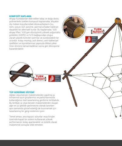 44KOMPOZ%u0130T KAPLAMAAh%u015fap hurdalardan elde edilen tala%u015f ve do%u011fa dostu polimerlerle %u00fcretilen kompozit kaplamalar, ah%u015fab%u0131n d%u0131%u015f mekan ko%u015fullar%u0131ndaki dezavantajlar%u0131n%u0131 (su, nem, yosun, k%u00fcf, %u00e7%u00fcr%u00fcme, yanma) ortadan kald%u0131ran dayan%u0131kl%u0131 bir alternatif sunar. Bu kaplamalar, %55 ah%u015fap lifleri, %30 geri d%u00f6n%u00fc%u015f%u00fcml%u00fc y%u00fcksek yo%u011funluklu polietilen (HDPE) ve %15 ba%u011flay%u0131c%u0131dan olu%u015fur. Zararl%u0131 plastik t%u00fcrevleri i%u00e7ermez ve s%u00fcrd%u00fcr%u00fclebilir bir %u00fcr%u00fcnd%u00fcr. Kolay montaj%u0131, asit direnci, anti-bakteriyel %u00f6zellikleri ve k%u0131ym%u0131klanmaz yap%u0131s%u0131yla dikkat %u00e7eker. %u00dcr%u00fcn %u00f6mr%u00fcn%u00fc tamamlad%u0131ktan sonra geri d%u00f6n%u00fc%u015f%u00fcme kazand%u0131r%u0131labilir.T%u00dcP GERD%u0130RME S%u0130STEM%u0130A%u011fdan veya benzer malzemelerden yap%u0131lm%u0131%u015f ip t%u0131rmanma oyun gruplar%u0131m%u0131z ve parkurlar%u0131m%u0131zda kulland%u0131%u011f%u0131m%u0131z %u00f6zel tasarlanm%u0131%u015f gerdirme tertibat%u0131d%u0131r. Bu tertibat, ip veya benzeri malzemelerden olu%u015fan a%u011f%u0131n en iyi %u015fekilde gerilmesine olanak tan%u0131rken ayn%u0131 zamanda g%u00f6rsel esteti%u011fi de bozmamak i%u00e7in tasarlanm%u0131%u015f bir gergi sistemini i%u00e7erir.Temel amac%u0131, ana ta%u015f%u0131y%u0131c%u0131 s%u00fctunlar veya kiri%u015fler %u00fczerinde kapal%u0131 bir sistem kullanarak y%u00fcksek performansl%u0131, kolay ayarlanabilir ve estetik olarak m%u00fckemmel sonu%u00e7lar elde etmektir.