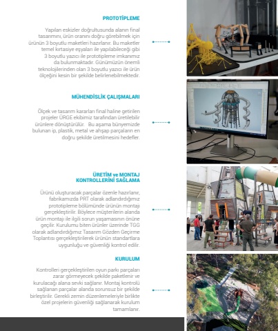 53M%u00dcHEND%u0130SL%u0130K %u00c7ALI%u015eMALARI%u00dcRET%u0130M ve MONTAJ KONTROLLER%u0130N%u0130 SA%u011eLAMAKURULUMPROTOT%u0130PLEME%u00d6l%u00e7ek ve tasar%u0131m kararlar%u0131 final haline getirilen projeler %u00dcRGE ekibimiz taraf%u0131ndan %u00fcretilebilir %u00fcr%u00fcnlere d%u00f6n%u00fc%u015ft%u00fcr%u00fcl%u00fcr. Bu a%u015fama b%u00fcnyemizde bulunan ip, plastik, metal ve ah%u015fap par%u00e7alar%u0131n en do%u011fru %u015fekilde %u00fcretilmesini hedefler.%u00dcr%u00fcn%u00fc olu%u015fturacak par%u00e7alar %u00f6zenle haz%u0131rlan%u0131r, fabrikam%u0131zda PRT olarak adland%u0131rd%u0131%u011f%u0131m%u0131z prototipleme b%u00f6l%u00fcm%u00fcnde %u00fcr%u00fcn%u00fcn montaj%u0131 ger%u00e7ekle%u015ftirilir. B%u00f6ylece m%u00fc%u015fterilerin alanda %u00fcr%u00fcn montaj%u0131 ile ilgili sorun ya%u015famas%u0131n%u0131n %u00f6n%u00fcne ge%u00e7ilir. Kurulumu biten %u00fcr%u00fcnler %u00fczerinde TGG olarak adland%u0131rd%u0131%u011f%u0131m%u0131z Tasar%u0131m G%u00f6zden Ge%u00e7irme Toplant%u0131s%u0131 ger%u00e7ekle%u015ftirilerek %u00fcr%u00fcn%u00fcn standartlara uygunlu%u011fu ve g%u00fcvenli%u011fi kontrol edilir. Kontrolleri ger%u00e7ekle%u015ftirilen oyun park%u0131 par%u00e7alar%u0131 zarar g%u00f6rmeyecek %u015fekilde paketlenir ve kurulaca%u011f%u0131 alana sevki sa%u011flan%u0131r. Montaj kontrol%u00fc sa%u011flanan par%u00e7alar alanda sorunsuz bir %u015fekilde birle%u015ftirilir. Gerekli zemin d%u00fczenlemeleriyle birlikte %u00f6zel projelerin g%u00fcvenli%u011fi sa%u011flanarak kurulum tamamlan%u0131r.Yap%u0131lan eskizler do%u011frultusunda alan%u0131n final tasar%u0131m%u0131n%u0131, %u00fcr%u00fcn oran%u0131n%u0131 do%u011fru g%u00f6rebilmek i%u00e7in %u00fcr%u00fcn%u00fcn 3 boyutlu maketleri haz%u0131rlan%u0131r. Bu maketler temel k%u0131rtasiye e%u015fyalar%u0131 ile yap%u0131labilece%u011fi gibi 3 boyutlu yaz%u0131c%u0131 ile prototipleme imkan%u0131m%u0131z da bulunmaktad%u0131r. G%u00fcn%u00fcm%u00fcz%u00fcn %u00f6nemli teknolojilerinden olan 3 boyutlu yaz%u0131c%u0131 ile %u00fcr%u00fcn %u00f6l%u00e7e%u011fini kesin bir %u015fekilde belirlenebilmektedir.
