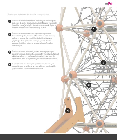 9111234243%u00dcr%u00fcn%u00fcn bu b%u00f6l%u00fcm%u00fcnde, e%u015fitlik, sosyalle%u015fme ve rol yapma gibi oyun de%u011ferleri %u00f6n planda tutularak tasar%u0131m yap%u0131lm%u0131%u015ft%u0131r. %u00c7ocuklar, bu de%u011ferleri g%u00f6z %u00f6n%u00fcnde bulundurarak %u00f6zg%u00fcrce hareket edebilecekleri alanlara sahip olurlar.%u00dcr%u00fcn%u00fcn bu b%u00f6l%u00fcm%u00fcnde daha kapsay%u0131c%u0131 bir yakla%u015f%u0131m benimsenmi%u015f olup, herkese hitap eden oturma, bir araya gelme ve ko%u015fma gibi etkinlikler d%u00fc%u015f%u00fcn%u00fclerek tasar%u0131m yap%u0131lm%u0131%u015ft%u0131r. T%u00fcm %u00e7ocuklar%u0131 bir araya getiren alanlar yarat%u0131larak, birlikte e%u011flenme ve sosyalle%u015fme f%u0131rsatlar%u0131 sunulmu%u015ftur.Kayd%u0131rak, t%u00fcm %u00e7ocuklar i%u00e7in heyecan verici bir deneyim sunar. Bu alan, emekleme ve kayma hissini en iyi %u015fekilde ya%u015fatmak i%u00e7in %u00f6zel olarak tasarlanm%u0131%u015ft%u0131r.%u00dcr%u00fcn%u00fcn bu k%u0131sm%u0131, t%u0131rmanma, as%u0131lma ve denge gibi oyun de%u011ferleri dikkate al%u0131narak tasarlanm%u0131%u015ft%u0131r. %u00c7ocuklar, bu fiziksel aktivitelerle hem motor becerilerini geli%u015ftirirken hem de e%u011flenceli ve aktif bir oyun deneyimi ya%u015fama f%u0131rsat%u0131 bulurlar.%u00dcr%u00fcn%u00fcn oyun de%u011ferlerine dair detaylar%u0131 inceleyebilirsiniz.