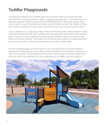 2Our play groups designed for children aged one and above stand out as structures that stimulate their natural curiosity and offer an engaging play experience. These play areas are planned to support children%u2019s physical and mental development. These play groups, which are arranged in a way that parents can easily reach and safely monitor, help children develop their muscle coordination through basic physical activities such as crawling and climbing.Various activities in our play groups help children develop their motor skills and balance skills, while also helping them gain self-confidence and stay physically active. Movement-oriented games such as climbing, crawling and exploring allow children to get to know their bodies better and become stronger. At the same time, these activities provide a fun learning process that improves children%u2019s hand-eye coordination and problem-solving skills.Properly designed playgroups encourage not only physical but also social and cognitive development. While playing in these areas, children establish social interaction and learn to share and cooperate. Our playgroups provide a warm and inviting environment where every child can spend time safely and fun, thus contributing to the healthy growth of children.Toddler Playgrounds