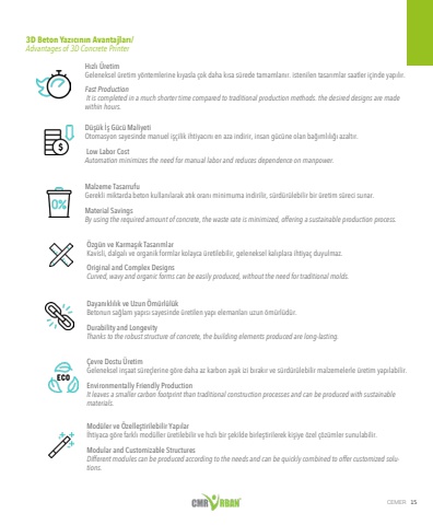 CEMER 153D Beton Yaz%u0131c%u0131n%u0131n Avantajlar%u0131/ Advantages of 3D Concrete PrinterH%u0131zl%u0131 %u00dcretim Geleneksel %u00fcretim y%u00f6ntemlerine k%u0131yasla %u00e7ok daha k%u0131sa s%u00fcrede tamamlan%u0131r. istenilen tasar%u0131mlar saatler i%u00e7inde yap%u0131l%u0131r.Fast Production It is completed in a much shorter time compared to traditional production methods. the desired designs are made within hours.Malzeme Tasarrufu Gerekli miktarda beton kullan%u0131larak at%u0131k oran%u0131 minimuma indirilir, s%u00fcrd%u00fcr%u00fclebilir bir %u00fcretim s%u00fcreci sunar.Material Savings By using the required amount of concrete, the waste rate is minimized, offering a sustainable production process.%u00d6zg%u00fcn ve Karma%u015f%u0131k Tasar%u0131mlarKavisli, dalgal%u0131 ve organik formlar kolayca %u00fcretilebilir, geleneksel kal%u0131plara ihtiya%u00e7 duyulmaz.Original and Complex DesignsCurved, wavy and organic forms can be easily produced, without the need for traditional molds.Dayan%u0131kl%u0131l%u0131k ve Uzun %u00d6m%u00fcrl%u00fcl%u00fck Betonun sa%u011flam yap%u0131s%u0131 sayesinde %u00fcretilen yap%u0131 elemanlar%u0131 uzun %u00f6m%u00fcrl%u00fcd%u00fcr.Durability and Longevity Thanks to the robust structure of concrete, the building elements produced are long-lasting.%u00c7evre Dostu %u00dcretim Geleneksel in%u015faat s%u00fcre%u00e7lerine g%u00f6re daha az karbon ayak izi b%u0131rak%u0131r ve s%u00fcrd%u00fcr%u00fclebilir malzemelerle %u00fcretim yap%u0131labilir.Environmentally Friendly Production It leaves a smaller carbon footprint than traditional construction processes and can be produced with sustainable materials.Mod%u00fcler ve %u00d6zelle%u015ftirilebilir Yap%u0131lar %u0130htiyaca g%u00f6re farkl%u0131 mod%u00fcller %u00fcretilebilir ve h%u0131zl%u0131 bir %u015fekilde birle%u015ftirilerek ki%u015fiye %u00f6zel %u00e7%u00f6z%u00fcmler sunulabilir.Modular and Customizable StructuresDifferent modules can be produced according to the needs and can be quickly combined to offer customized solutions.D%u00fc%u015f%u00fck %u0130%u015f G%u00fcc%u00fc Maliyeti Otomasyon sayesinde manuel i%u015f%u00e7ilik ihtiyac%u0131n%u0131 en aza indirir, insan g%u00fcc%u00fcne olan ba%u011f%u0131ml%u0131l%u0131%u011f%u0131 azalt%u0131r. Low Labor Cost Automation minimizes the need for manual labor and reduces dependence on manpower.