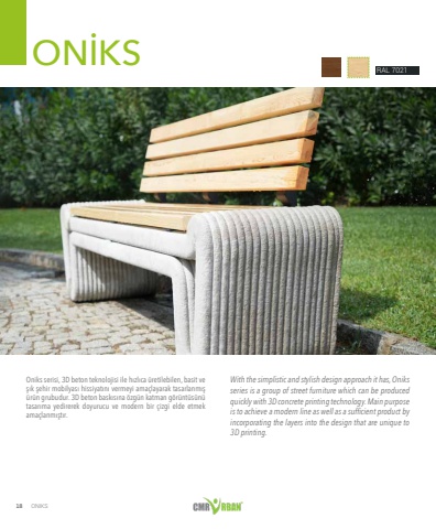 18 ONIKSOniks serisi, 3D beton teknolojisi ile h%u0131zl%u0131ca %u00fcretilebilen, basit ve %u015f%u0131k %u015fehir mobilyas%u0131 hissiyat%u0131n%u0131 vermeyi ama%u00e7layarak tasarlanm%u0131%u015f %u00fcr%u00fcn grubudur. 3D beton bask%u0131s%u0131na %u00f6zg%u00fcn katman g%u00f6r%u00fcnt%u00fcs%u00fcn%u00fc tasar%u0131ma yedirerek doyurucu ve modern bir %u00e7izgi elde etmek ama%u00e7lanm%u0131%u015ft%u0131r. With the simplistic and stylish design approach it has, Oniks series is a group of street furniture which can be produced quickly with 3D concrete printing technology. Main purpose is to achieve a modern line as well as a sufficient product by incorporating the layers into the design that are unique to 3D printing.ON%u0130KSRAL 7021