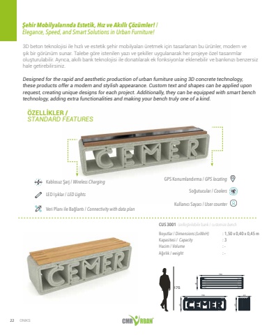 22 ONIKSKablosuz %u015earj / Wireless ChargingLED I%u015f%u0131klar / LED LightsVeri Plan%u0131 ile Ba%u011flant%u0131 / Connectivity with data planGPS Konumland%u0131rma / GPS locatingSo%u011futucular / CoolersKullan%u0131c%u0131 Sayac%u0131 / User counterBoyutlar / Dimensions (LxWxH)Kapasitesi / CapacityHacim / Volume A%u011f%u0131rl%u0131k / weightCUS 3001 %u00f6zelle%u015ftirilebilir bank / customize bench: 1,50 x 0,40 x 0,45 m: 3: -: -150454045150401753D beton teknolojisi ile h%u0131zl%u0131 ve estetik %u015fehir mobilyalar%u0131 %u00fcretmek i%u00e7in tasarlanan bu %u00fcr%u00fcnler, modern ve %u015f%u0131k bir g%u00f6r%u00fcn%u00fcm sunar. Talebe g%u00f6re istenilen yaz%u0131 ve %u015fekiller uygulanarak her projeye %u00f6zel tasar%u0131mlar olu%u015fturulabilir. Ayr%u0131ca, ak%u0131ll%u0131 bank teknolojisi ile donat%u0131larak ek fonksiyonlar eklenebilir ve bank%u0131n%u0131z%u0131 benzersiz hale getirebilirsiniz.Designed for the rapid and aesthetic production of urban furniture using 3D concrete technology, these products offer a modern and stylish appearance. Custom text and shapes can be applied upon request, creating unique designs for each project. Additionally, they can be equipped with smart bench technology, adding extra functionalities and making your bench truly one of a kind.%u00d6ZELL%u0130KLER / STANDARD FEATURES%u015eehir Mobilyalar%u0131nda Estetik, H%u0131z ve Ak%u0131ll%u0131 %u00c7%u00f6z%u00fcmler! / Elegance, Speed, and Smart Solutions in Urban Furniture!
