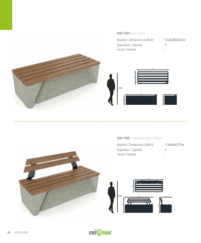26 MODULINEBoyutlar / Dimensions (LxWxH)Kapasitesi / CapacityHacim / VolumeBoyutlar / Dimensions (LxWxH)Kapasitesi / CapacityHacim / VolumeCUS 1101 bank / benchCUS 1102 s%u0131rtl%u0131kl%u0131 bank / backrest bench:1,5x0,59x0,43 m: 3: -: 1,5x0,6x0,79 m : 3: -17515043594315059175 150 79607915060