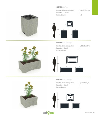 MODULINE 27Boyutlar / Dimensions (LxWxH)Kapasitesi / CapacityHacim / VolumeBoyutlar / Dimensions (LxWxH)Kapasitesi / CapacityHacim / VolumeCUS 1104 saks%u0131 / flower potCUS 1105 saks%u0131 / flower pot: 1,0x0,58x0,39 m: -: -: 0,69x0,58x0,39: -: -Boyutlar / Dimensions (LxWxH)Kapasitesi / CapacityHacim / VolumeCUS 1103 %u00e7%u00f6p / bin: 0,64x0,58x0,8 m: -: 56L175 61 805880615817558 100395839100175396958583969
