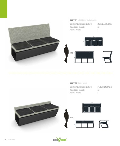34 SACTRABoyutlar / Dimensions (LxWxH)Kapasitesi / CapacityHacim / VolumeBoyutlar / Dimensions (LxWxH)Kapasitesi / CapacityHacim / VolumeCUS 1151 s%u0131rtl%u0131kl%u0131 bank / backrest benchCUS 1152 bank / bench:1,35x0,64x0,82 m: 3: -: 1,35x0,64x0,48 m : 3: -17513564 13582648217548644813564135