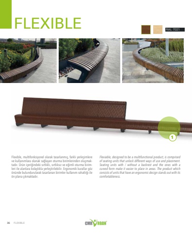 36 FLEXIBLEFLEXIBLE RAL 7021Flexible, multifonksiyonel olarak tasarlanm%u0131%u015f, farkl%u0131 yerle%u015fimlere ve kullan%u0131mlara olanak sa%u011flayan oturma birimlerinden olu%u015fmaktad%u0131r. %u00dcr%u00fcn i%u00e7eri%u011findeki s%u0131rtl%u0131kl%u0131, s%u0131rtl%u0131ks%u0131z ve e%u011fimli oturma birimleri ile alanlara kolayl%u0131kla yerle%u015ftirilebilir. Ergonomik kurallar g%u00f6z %u00f6n%u00fcnde bulundurularak tasarlanan birimler kullan%u0131m rahatl%u0131%u011f%u0131 ile %u00f6n plana %u00e7%u0131kmaktad%u0131r.Flexiable, designed to be a multifunctional product, is comprised of seating units that unlock different ways of use and placement. Seating units with / without a backrest and the ones with a curved form make it easier to place in areas. The product which consists of units that have an ergonomic design stands out with its comfortableness.1