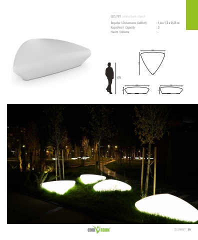 GLOWSIT 39Boyutlar / Dimensions (LxWxH)Kapasitesi / CapacityHacim / VolumeCUS 701 s%u0131rtl%u0131ks%u0131z bank / bench: 1,6 x 1,5 x 0,45 m: 3: - 1601501604515045175