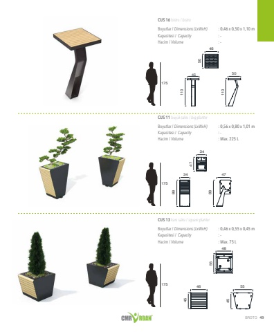 BROTO 49Boyutlar / Dimensions (LxWxH)Kapasitesi / CapacityHacim / VolumeBoyutlar / Dimensions (LxWxH)Kapasitesi / CapacityHacim / VolumeBoyutlar / Dimensions (LxWxH)Kapasitesi / CapacityHacim / VolumeCUS 16 bistro / bistroCUS 11 b%u00fcy%u00fck saks%u0131 / big planterCUS 13 kare saks%u0131 / square planter: 0,46 x 0,50 x 1,10 m: -: - : 0,56 x 0,80 x 1,01 m: -: Max. 225 L : 0,46 x 0,55 x 0,45 m: -: Max. 75 L4617517517550110 11046503434 47 4789894646 55 554545