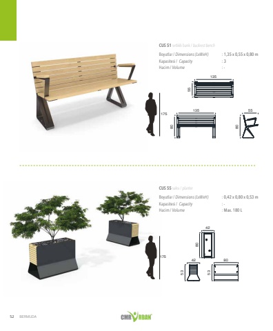52 BERMUDABoyutlar / Dimensions (LxWxH)Kapasitesi / CapacityHacim / VolumeBoyutlar / Dimensions (LxWxH)Kapasitesi / CapacityHacim / VolumeCUS 51 s%u0131rtl%u0131kl%u0131 bank / backrest benchCUS 55 saks%u0131 / planter: 1,35 x 0,55 x 0,80 m: 3: -: 0,42 x 0,80 x 0,53 m: -: Max. 180 L 17517513555558080135428080535342