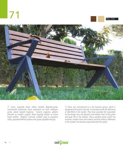 76 7171 Serisi, piyasada tespit edilen eksiklik do%u011frultusunda, marinalarda kullanmak %u00fczere tasarlanan bir kent mobilyas%u0131 grubu olarak ba%u015flad%u0131 hayat%u0131na. Tasar%u0131m %u00e7izgisine, yatlar%u0131n dinamik ve modern %u00e7izgileri ilham kayna%u011f%u0131 oldular ve %u00fcr%u00fcne hayat verdiler. B%u00f6ylece; minimal, modern %u00e7izgi ve y%u00fczeylere sahip, piyasada farkl%u0131l%u0131k yaratan %u00fcr%u00fcn grubu ger%u00e7ekle bulu%u015ftu.71 Serie, has commenced as a city furniture group, which is designed to be used in marinas, in accordance with the deficiency of identified in the market. They have provided the inspiration for the design line, the dynamic and modern lines of the yachts and gave life to the product. Thus,a product group which has minimal, modern lines and surfaces and that makes a difference in the market, has become acquainted with the reality.71 RAL 7021