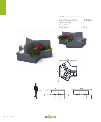 80 BUMERANGBoyutlar / Dimensions (LxWxH)Kapasitesi / CapacityHacim / Volume A%u011f%u0131rl%u0131k / weightCUS 301 saks%u0131 bank / planter bench: 1,9 x 2,18 x 0,9: 6: -: 420 kg175190190 218 2189090