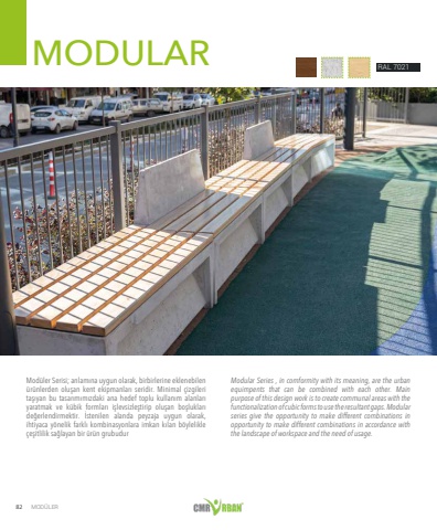 82 MOD%u00dcLERMod%u00fcler Serisi; anlam%u0131na uygun olarak, birbirlerine eklenebilen %u00fcr%u00fcnlerden olu%u015fan kent ekipmanlar%u0131 seridir. Minimal %u00e7izgileri ta%u015f%u0131yan bu tasar%u0131m%u0131m%u0131zdaki ana hedef toplu kullan%u0131m alanlar%u0131 yaratmak ve k%u00fcbik formlar%u0131 i%u015flevsizle%u015ftirip olu%u015fan bo%u015fluklar%u0131 de%u011ferlendirmektir. %u0130stenilen alanda peyzaja uygun olarak, ihtiyaca y%u00f6nelik farkl%u0131 kombinasyonlara imkan k%u0131lan b%u00f6ylelikle %u00e7e%u015fitlilik sa%u011flayan bir %u00fcr%u00fcn grubudurModular Series , in comformity with its meaning, are the urban equimpents that can be combined with each other. Main purpose of this design work is to create communal areas with the functionalization of cubic forms to use the resultant gaps. Modular series give the opportunity to make different combinations in opportunity to make different combinations in accordance with the landscape of workspace and the need of usage.MODULAR RAL 7021
